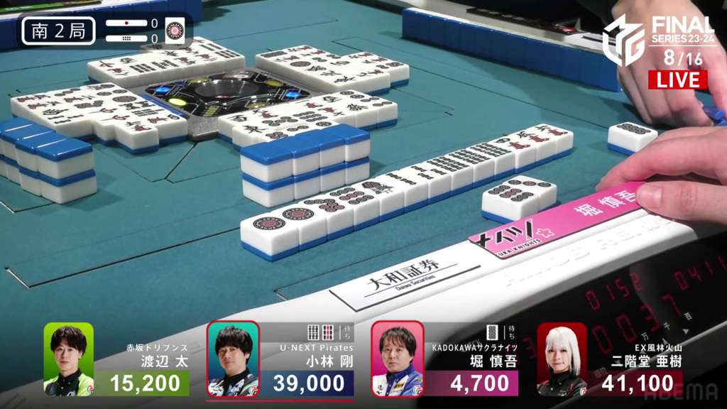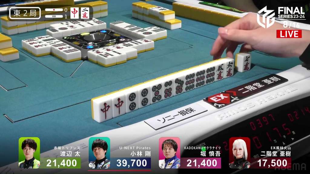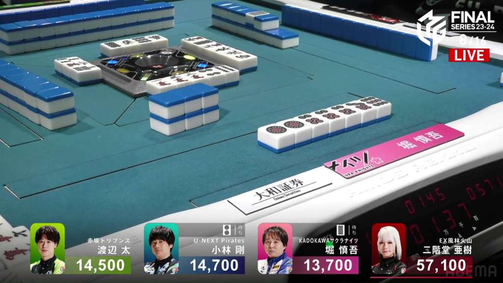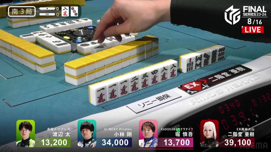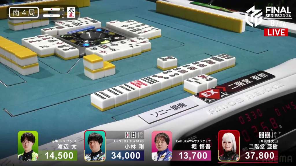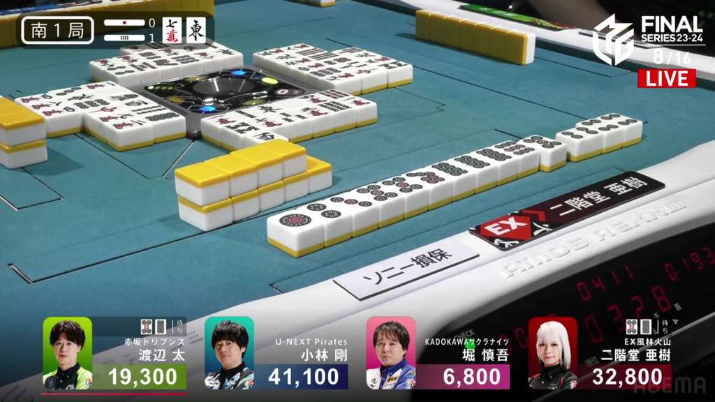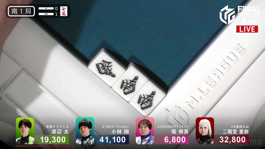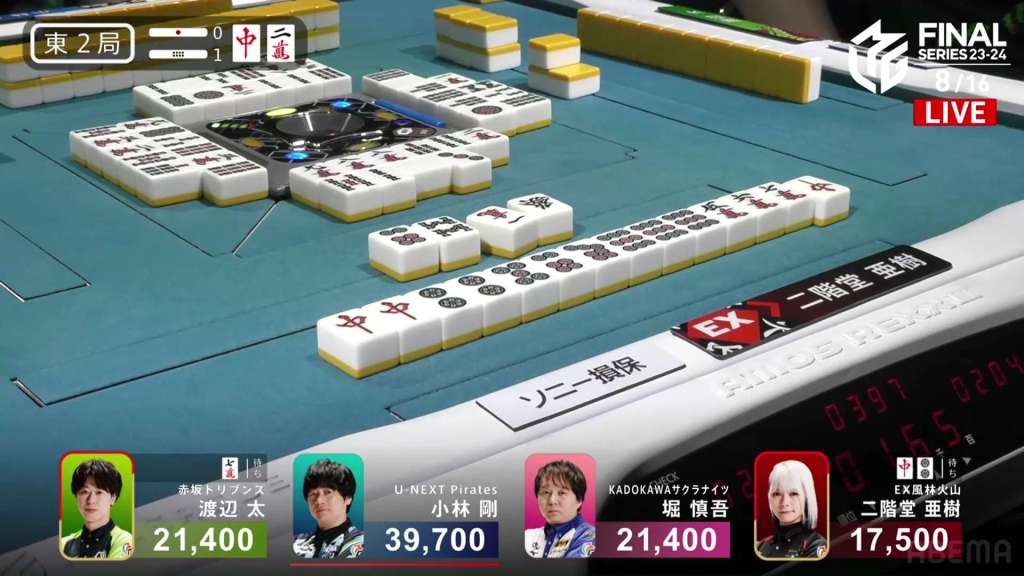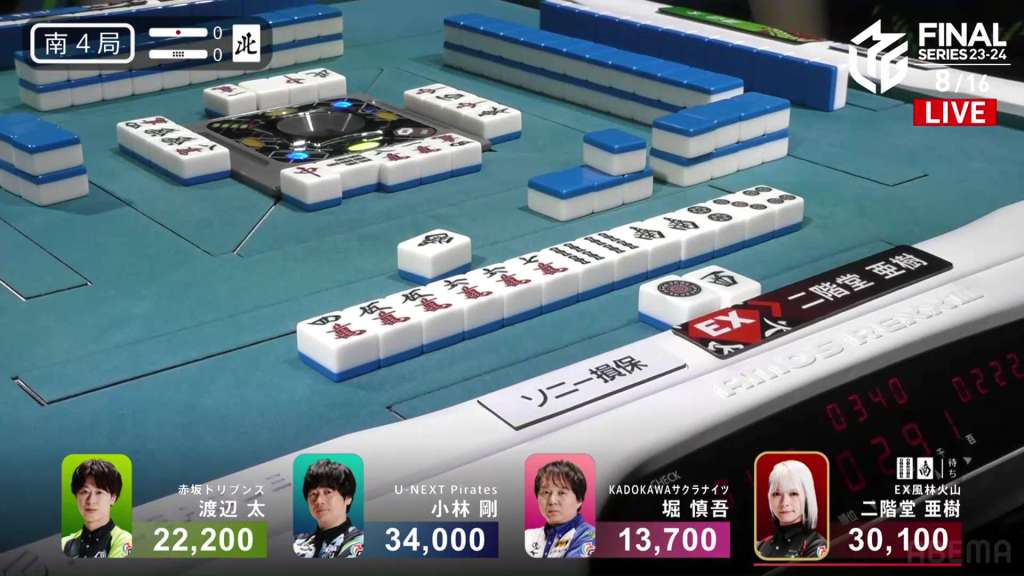 In E2-1, Aki is in 4th place, 22,200 behind 1st place dealer Kobayashi and 3,900 behind the 2nd place tie. With the finals approaching the halfway point, Aki wants to make sure that the U-Next Pirates don’t run away with it.
