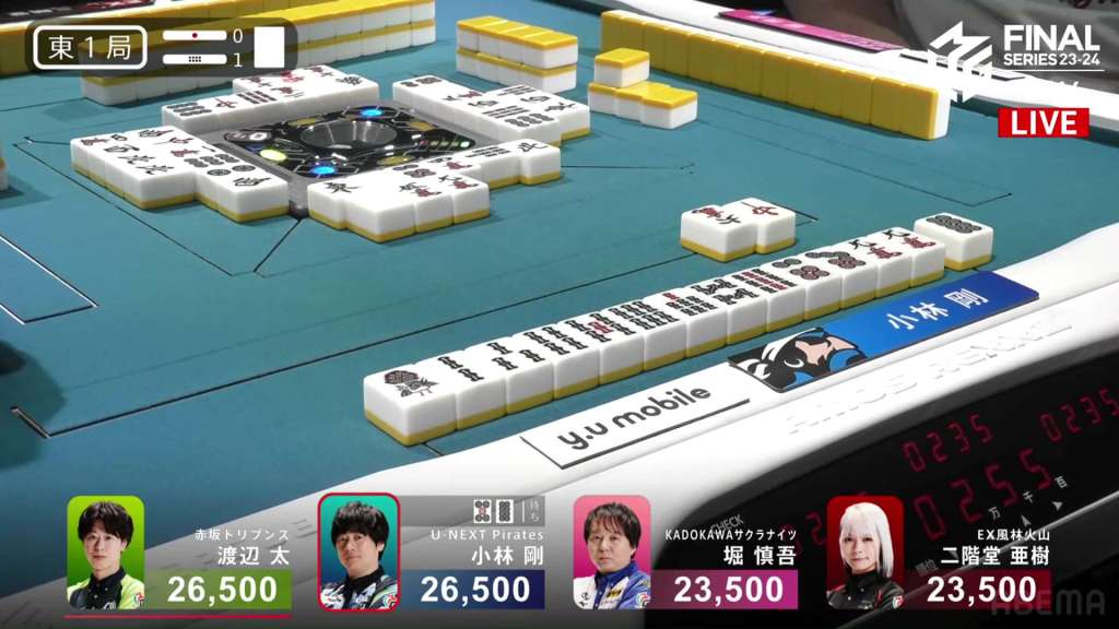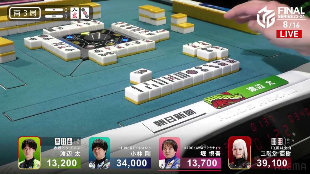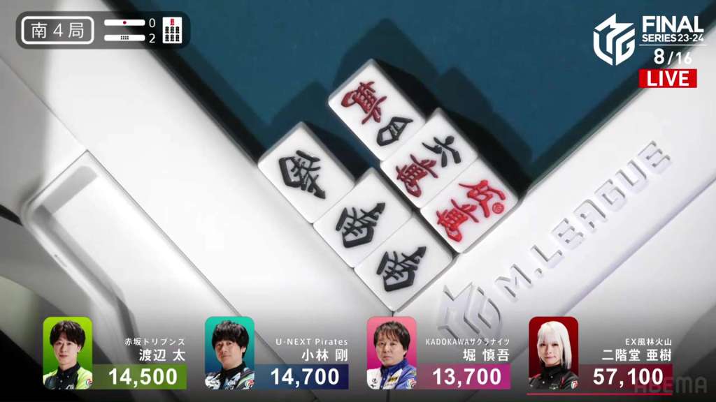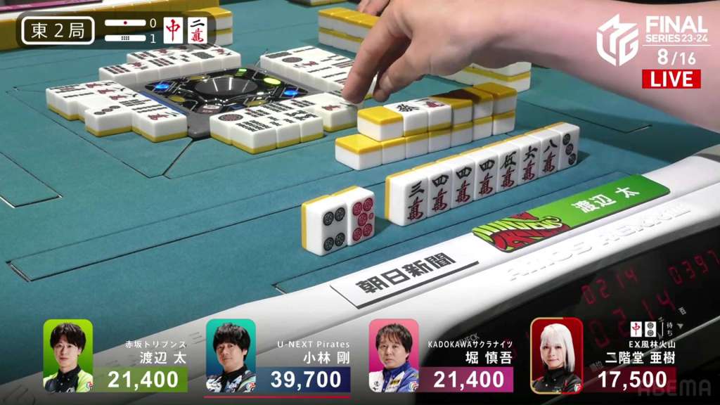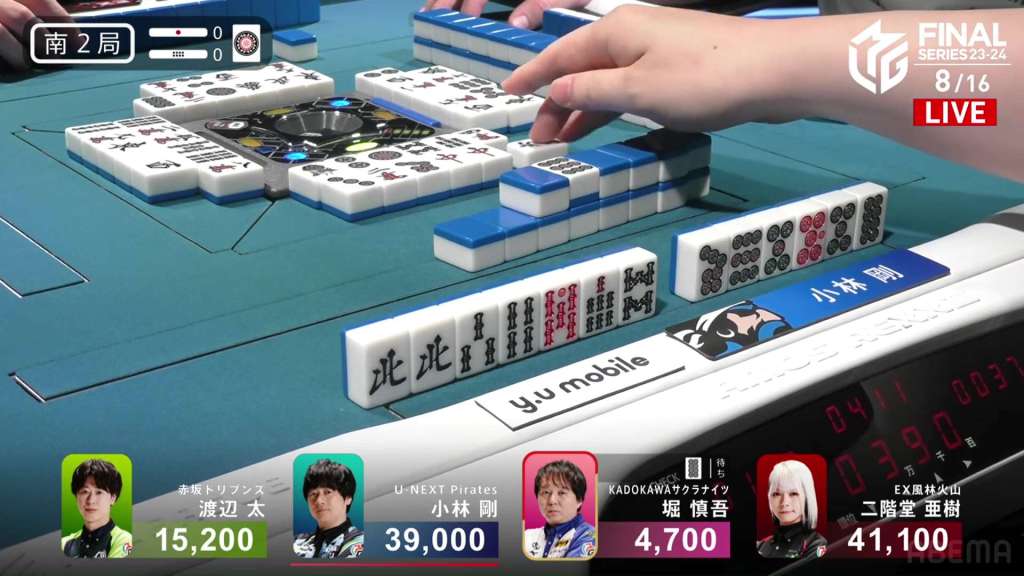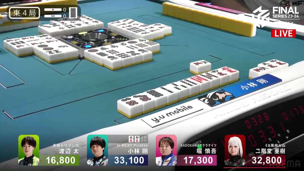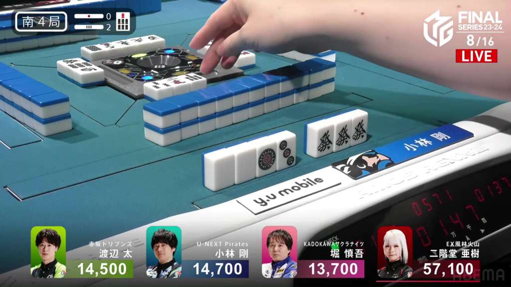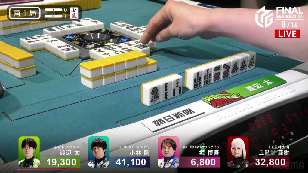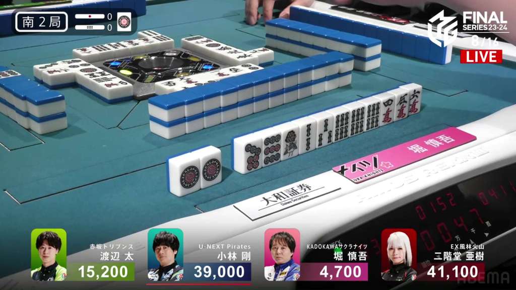 In E2-1, Aki is in 4th place, 22,200 behind 1st place dealer Kobayashi and 3,900 behind the 2nd place tie. With the finals approaching the halfway point, Aki wants to make sure that the U-Next Pirates don’t run away with it.