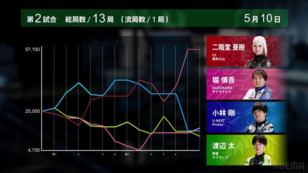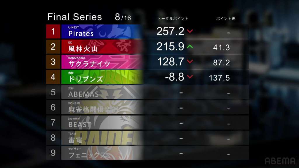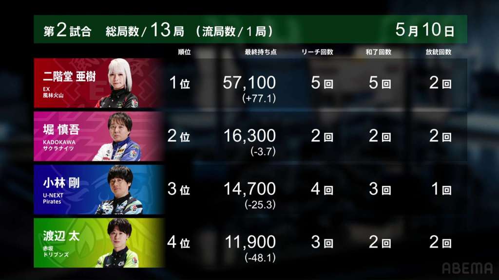 The big risk by Aki was greatly rewarded with a big 1st place and pushing Kobayashi into 3rd place. With a more than 100.0pts swing in a single game, the EX Furinkazan now trail the U-Next Pirates by just 41.3pts. The unfortunate 4th place for Futoshi means that the team falls back down into the negatives.