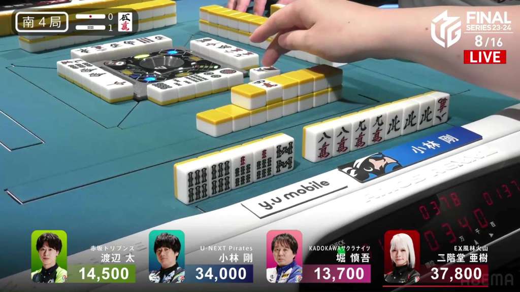 In S4-2, the scores between 2nd place Kobayashi, 3rd place Futoshi and 4th place Hori are very close. With just 1,000 separating 2nd and 4th, the next of the three to win will finish in 2nd. The one who deals in will finish in 4th.