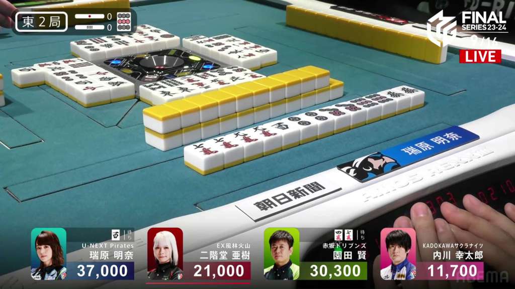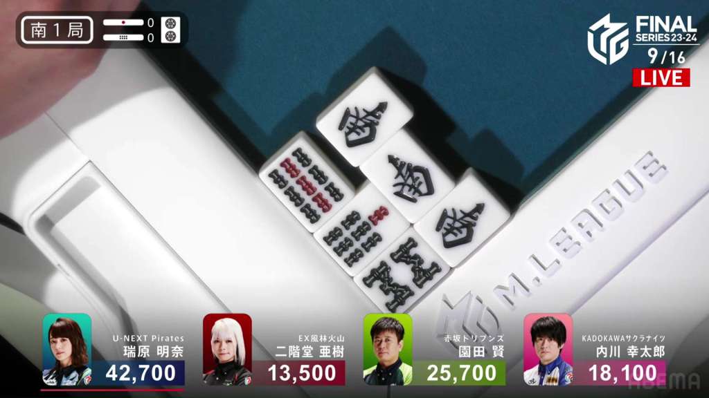 On Mizuhara’s draw, she gets the 9p dora. With her sixth pair set, she stays dama and waits on the west. On Uchikawa’s turn, he draws the west. With two already out on the table, the only way that the west would deal in is with a tanki or thirteen orphans. Flashbacks of that one suuankou tanki go through fans’ heads. With the west wait being unlikely, Uchikawa takes no time to discard it and deals into Mizuhara. Mizuhara wins the hand with Chiitoi/Dora 2 for 6,400, taking her above 40,000.