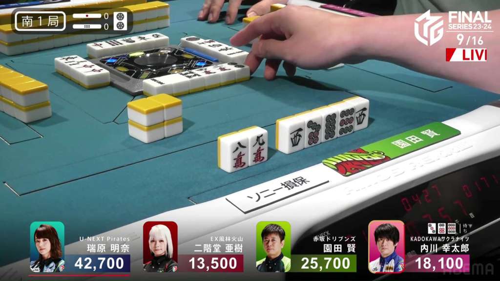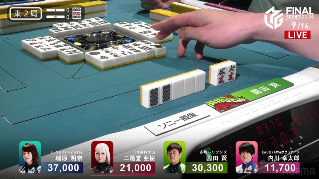 On Uchikawa’s draw, he gets the 6s. With Sonoda so close, folding and letting it go to a draw will put him in 3rd. If Aki wins with a haneman tsumo or greater. he would fall into last. With the 6s being safe against Aki and never wanting to discard the 7s dora, Uchikawa discards the 6s and deals into Sonoda.