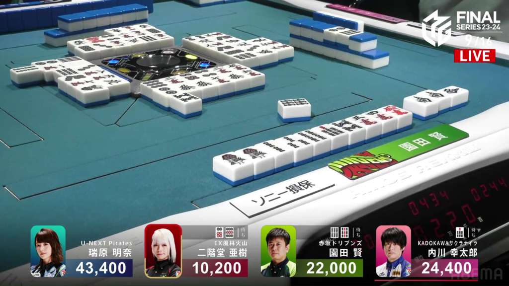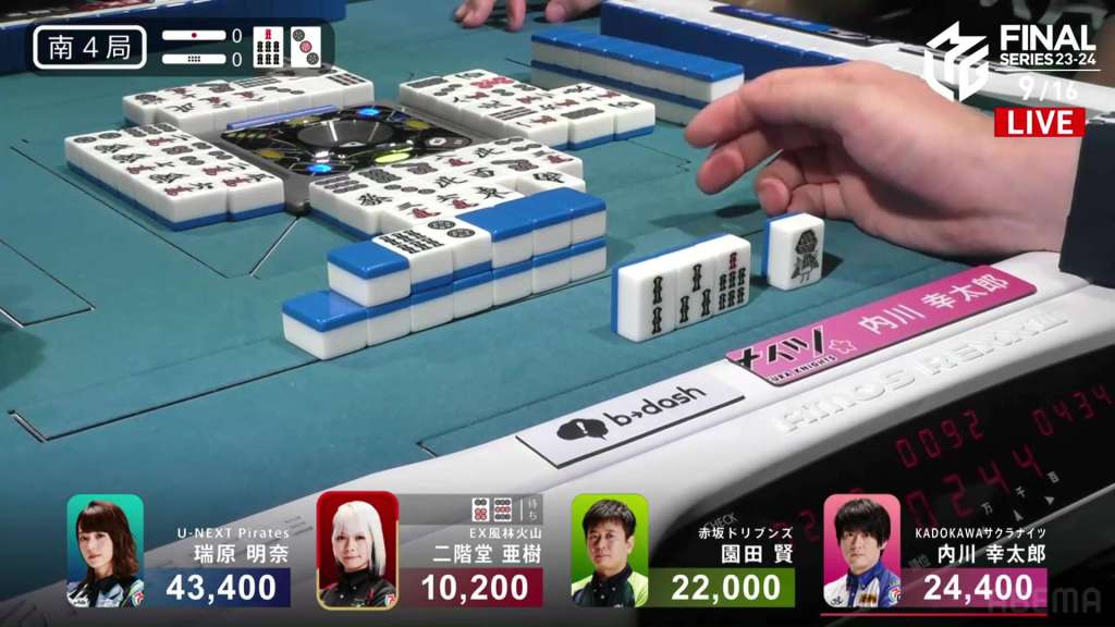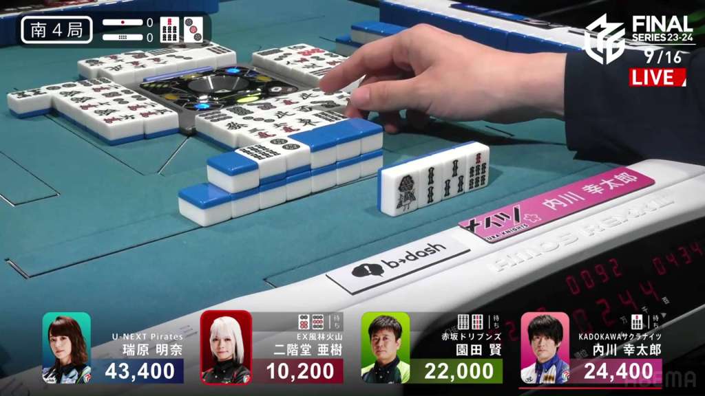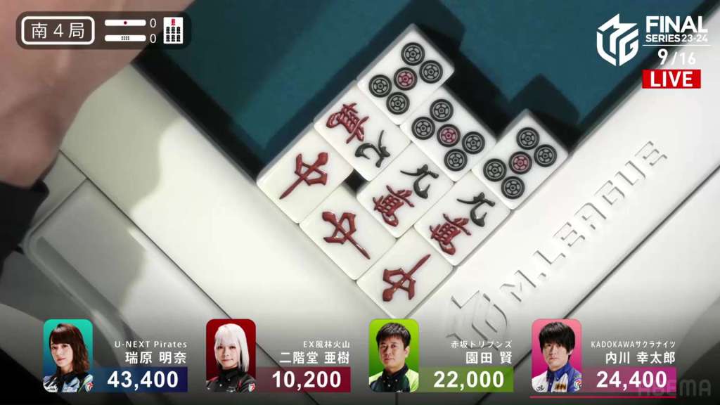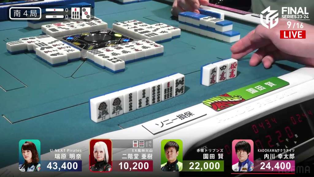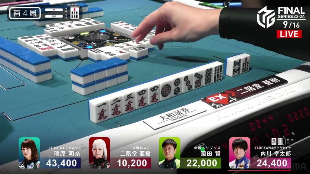 In S4-0, Aki is in 4th place, Sonoda is in 3rd place and Uchikawa is the dealer in 2nd place. The space between Aki and Sonoda is 11,800, while the space between Sonoda and Uchikawa is just 2,400. For Sonoda to finish with a positive score, he needs a 1/40 direct hit, a 2/30 tsumo or a 2/40 ron.
