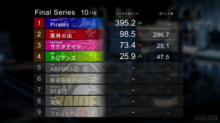 After the U-Next Pirates’ daily double yesterday, they are almost 300.0pts ahead of the 2nd place EX Furinkazan. For the bottom three ranks, they are only separated by 72.6pts. A good win can put a team into 2nd place.