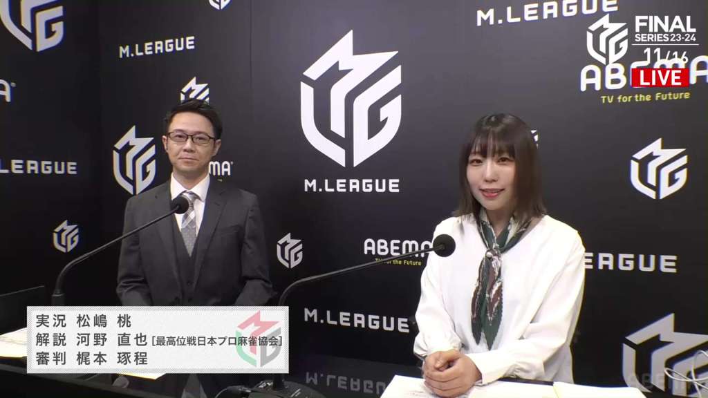 Commentating for the final time this season is Matsushima Momo. Next to her doing the colour commentary is Saikouisen pro Kouno Naoya.