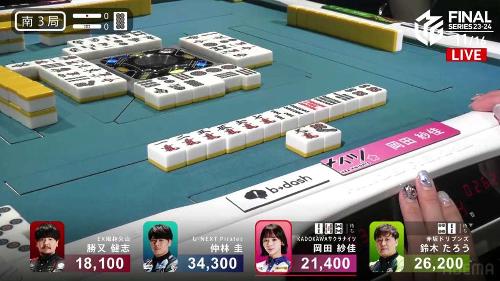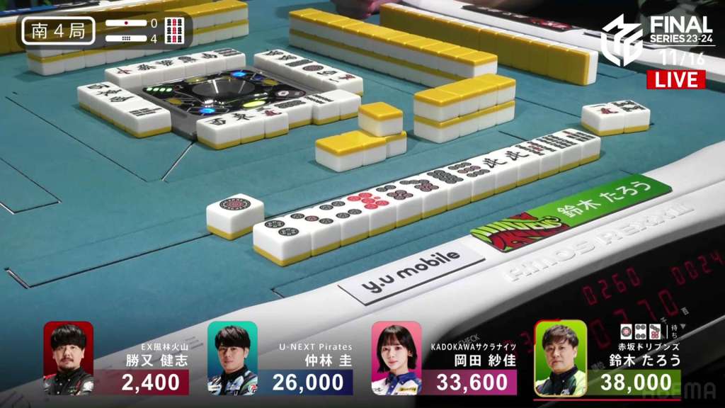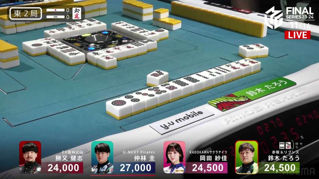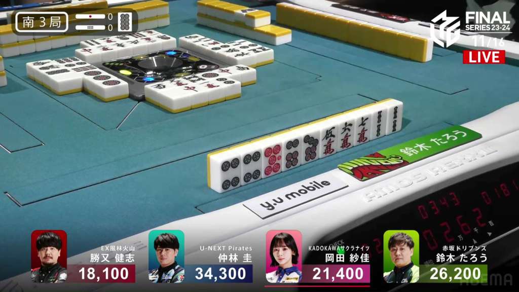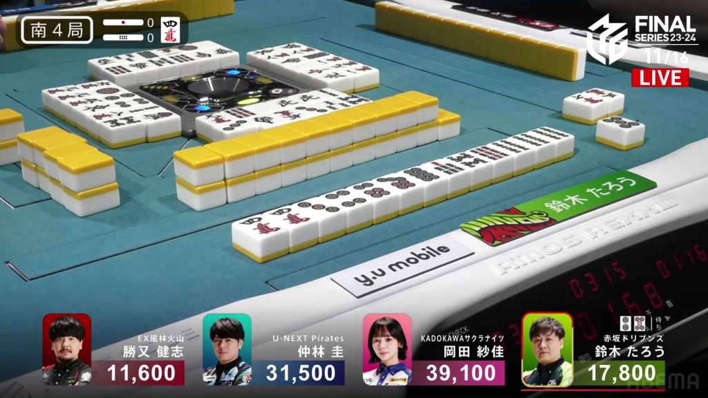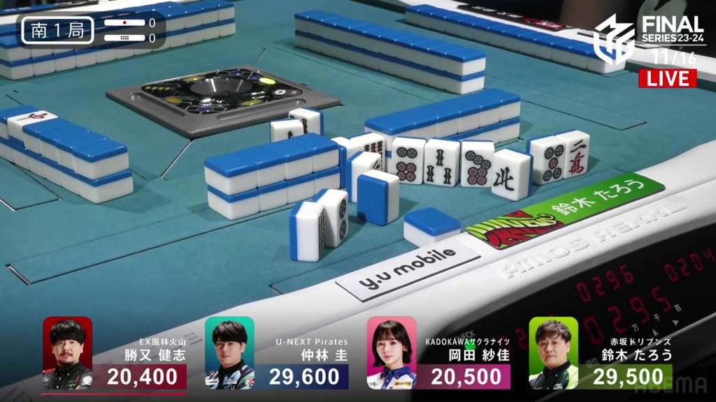 As S1-0 was starting up, Taro’s hand exploded. As he tried to flip his tiles up, tiles in his hand crashed into his wall and knocked down some tiles. All the players stopped and the referee Kajimoto chimed in. The games was paused while the rulebook and the replay was checked to figure what happened and which tiles were Taro’s.