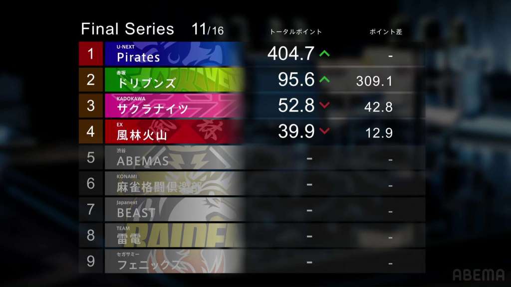 With Taro’s win, the Akasaka Drivens move up two spot, going from 4th to 2nd. However, with Nakabayashi’s solid 2nd place, the U-Next Pirates’ lead actually increases to 309.1pts. The 2nd place also puts them above 400.0pts for the first time in these finals. Unfortunately for the EX Furinkazan, Katsumata’s 4th place ends up taking the team down to 4th place. But, the scores are still close with 5 more games left.