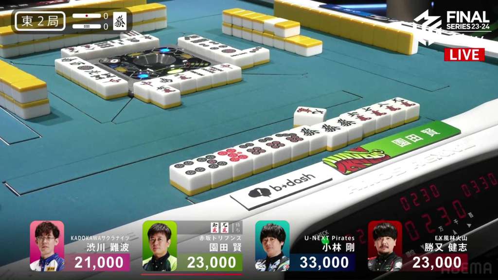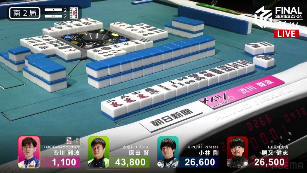 In S2-2, there are two riichi sticks and two honba on the table. Shibukawa is in 4th place and is sitting 25,400 behind 3rd place Katsumata. With Shibukawa’s dealership already passed, he has to go. He has to go now.