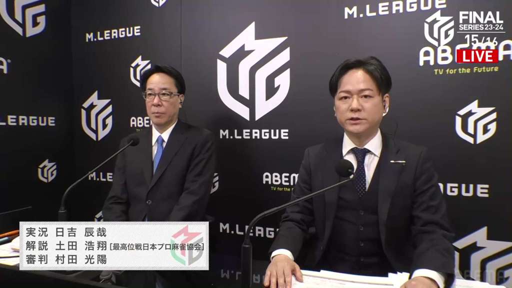 For this final day of M-League action, we had the classic duo of Hiyoshi Tatsuya and Tsuchida Kousho in the commentating booth.