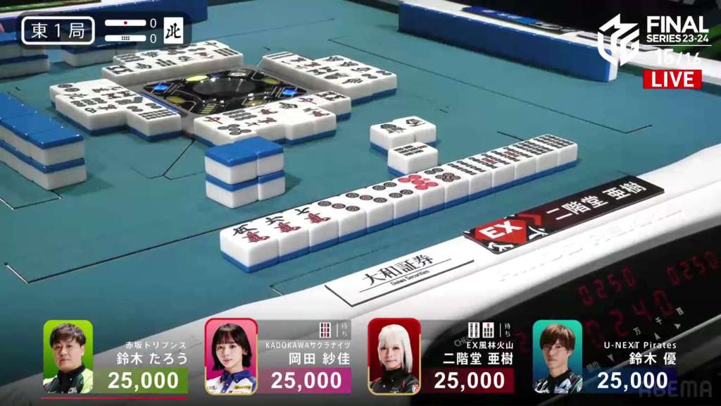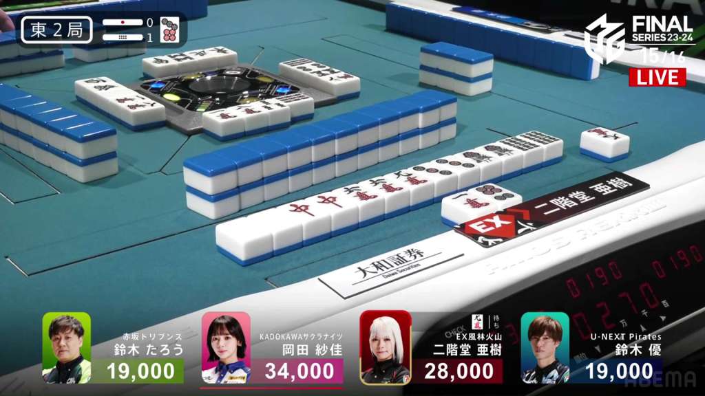 In E2-0, Okada is the dealer in 4th place, trying to catch up to Aki after Okada dealt a mangan into her.