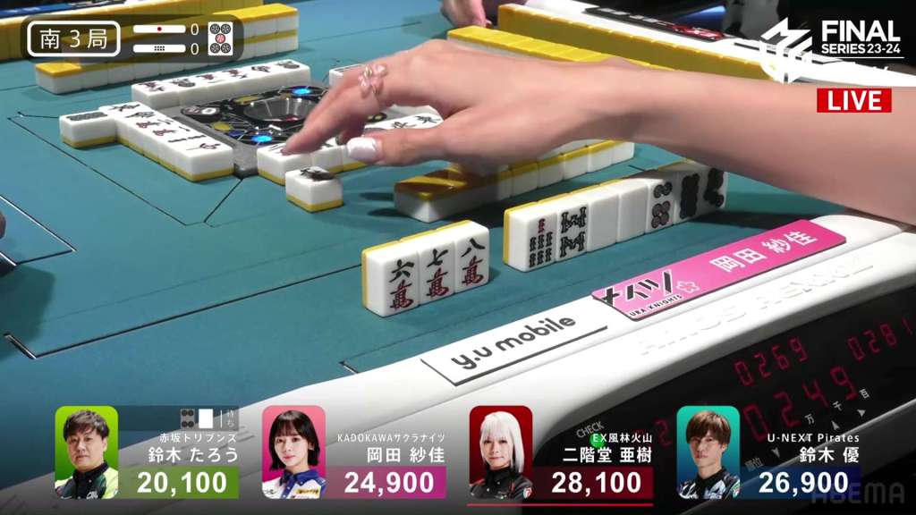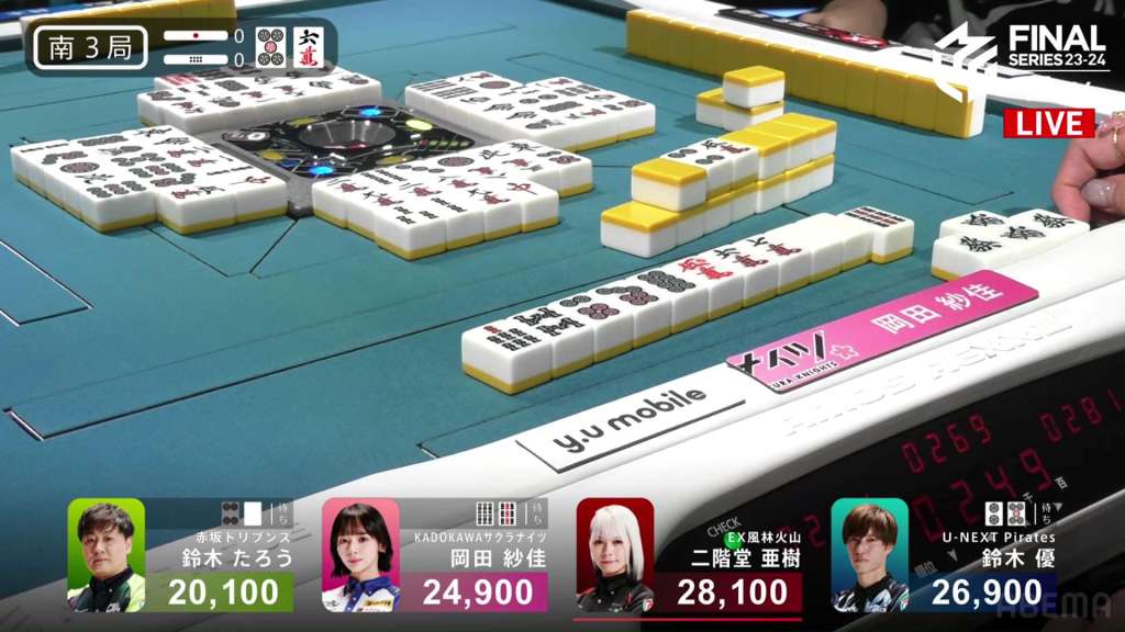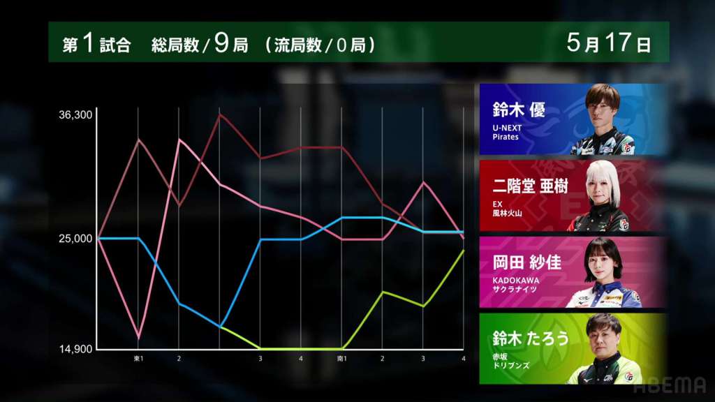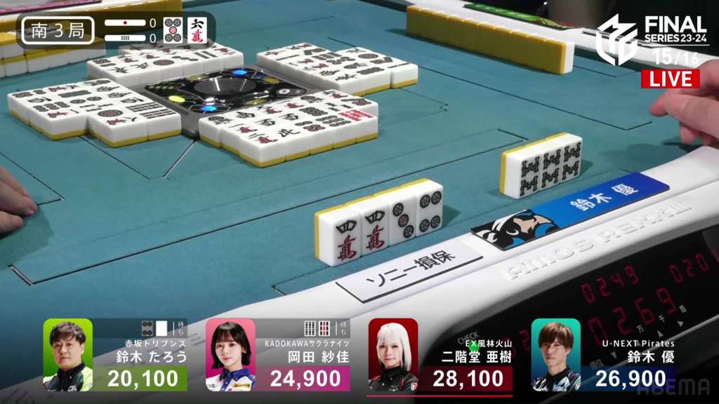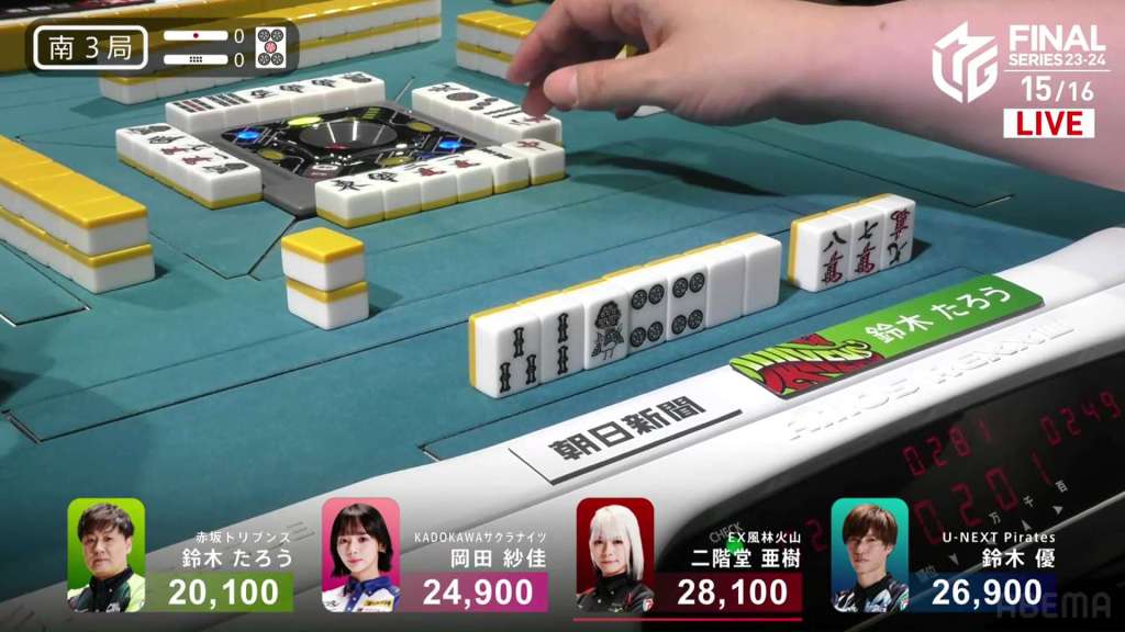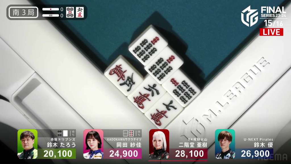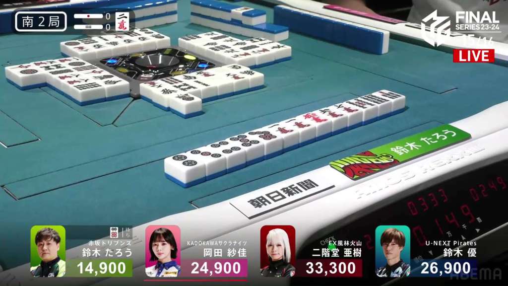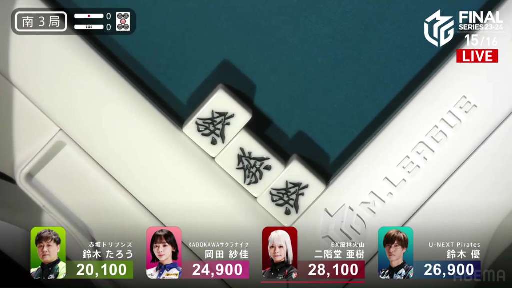 At first, it seemed like a very weird choice, especially since he doesn’t move out of last. However, if we broaden our perspective, we can see this stroke of genius. Before the win, Okada was in 1st place. Under a 1st/4th scenario, the Kadokawa Sakura Knights would get quite close to the Akasaka Drivens in the standings. However, with the direct hit, Okada moves out of 1st place and into 3rd. Sitting with 25,600 is Yu, who moves up to 1st place and actually wins the game. With the win, Yu also gets the big oka/uma bonus. With Taro’s win, he denies his major rivals the 1st place bonus and thus minimizes his losses.