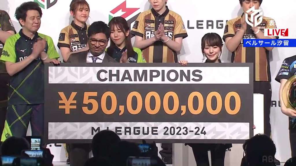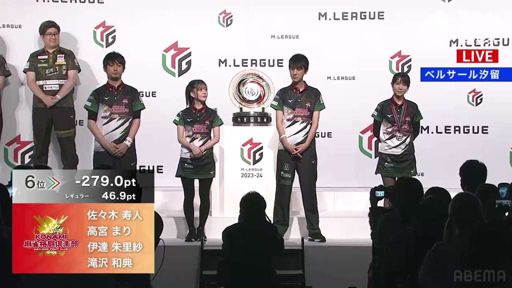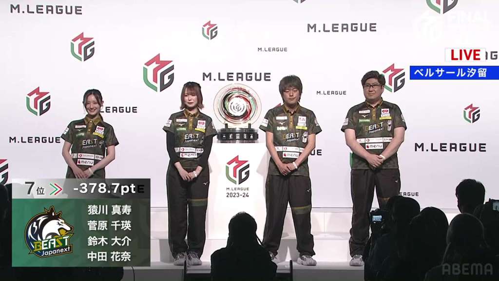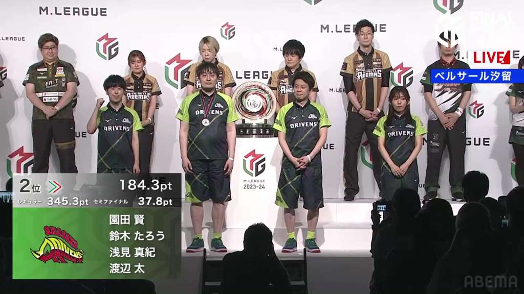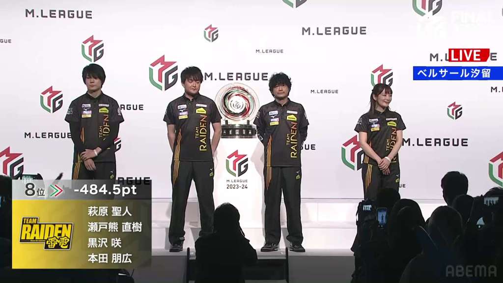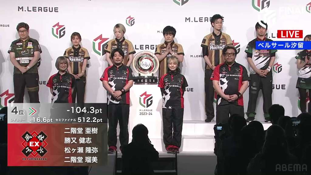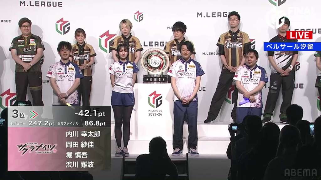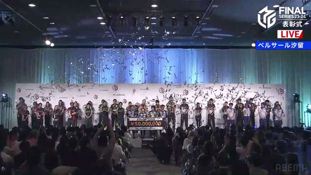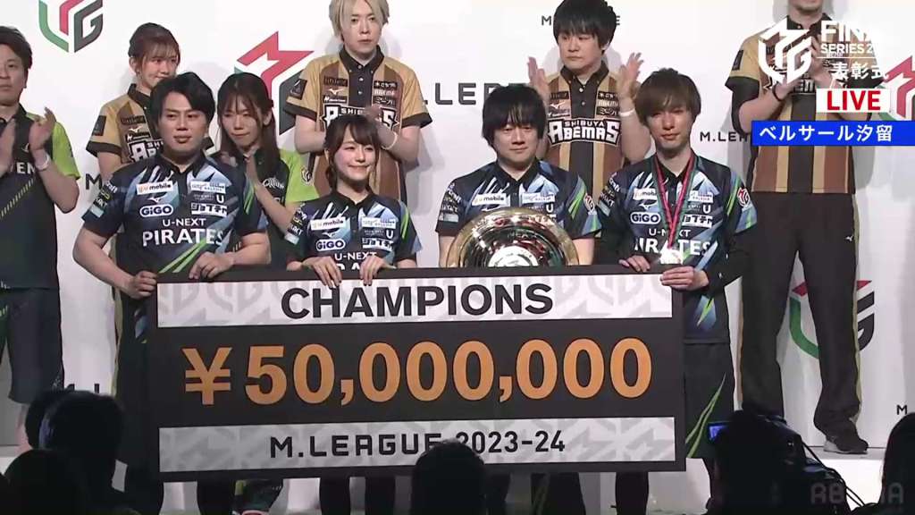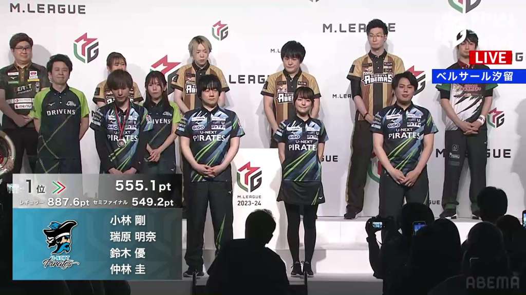 One final team remained. As the room was bathed in blue light, the U-Next Pirates walked down the aisle and waved at the fans. The U-Next Pirates finished the season in 1st place and the M-League 2023-24 Champions. They finished with a score of +887.6pts in the regular season, +549.2pts in the semifinals and +555.1pts in the finals.