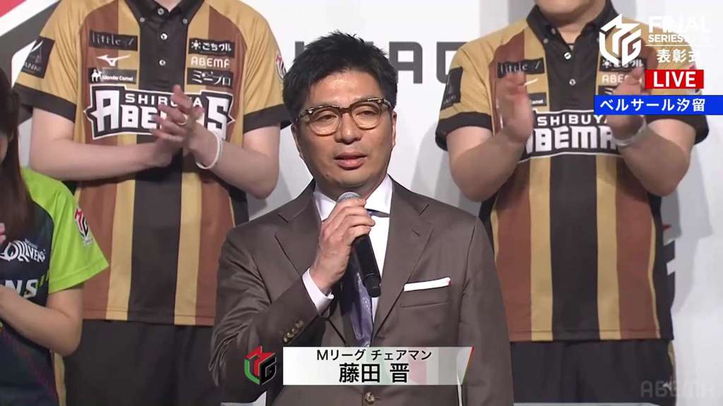 After the pictures, the four of them stepped aside and Fujita-chairman gave one more speech. He congratulated the U-Next Pirates on their win and reminisced about the past 6 season of M-League. At the end of his speech, he officially closed the M-League 2023-24 Season.