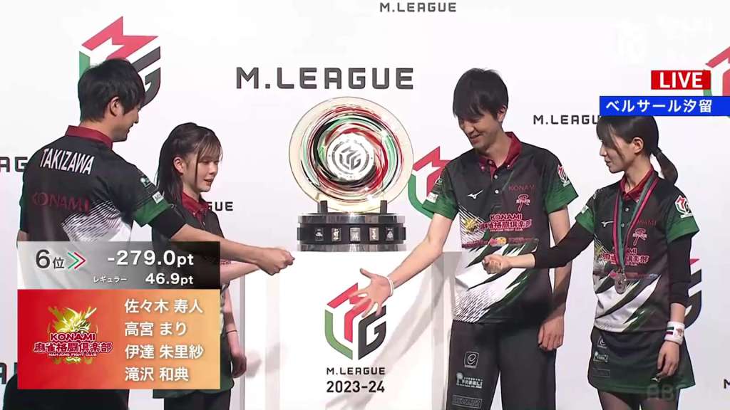 In 6th place, with a score of +46.9pts during the regular season and -279.0pts in the semifinals, is the Konami Mahjong Fight Club. In a fun game of rock-paper-scissors, Hisato was chosen to be the one to give the speech.