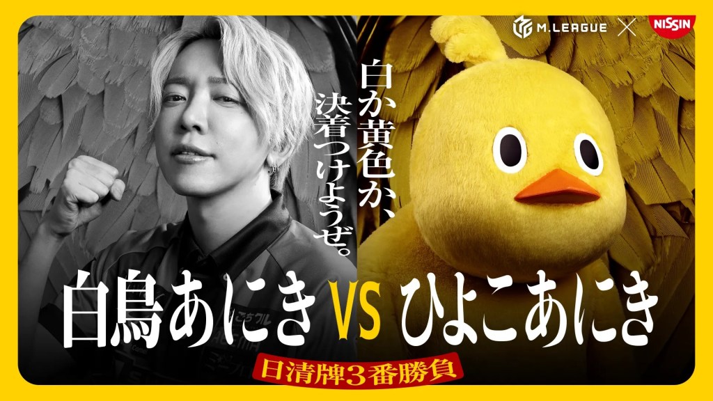 Chicken Ramen presents: Shiratori-aniki vs. Hiyoko-aniki has Shibuya Abemas player Shiratori Sho (白鳥翔) (whose family name literally means “swan” or “white bird”) facing off against Nissin Foods’ mascot Hiyoko-aniki (the full-size version of Hiyoko-chan) in three different challenges:
