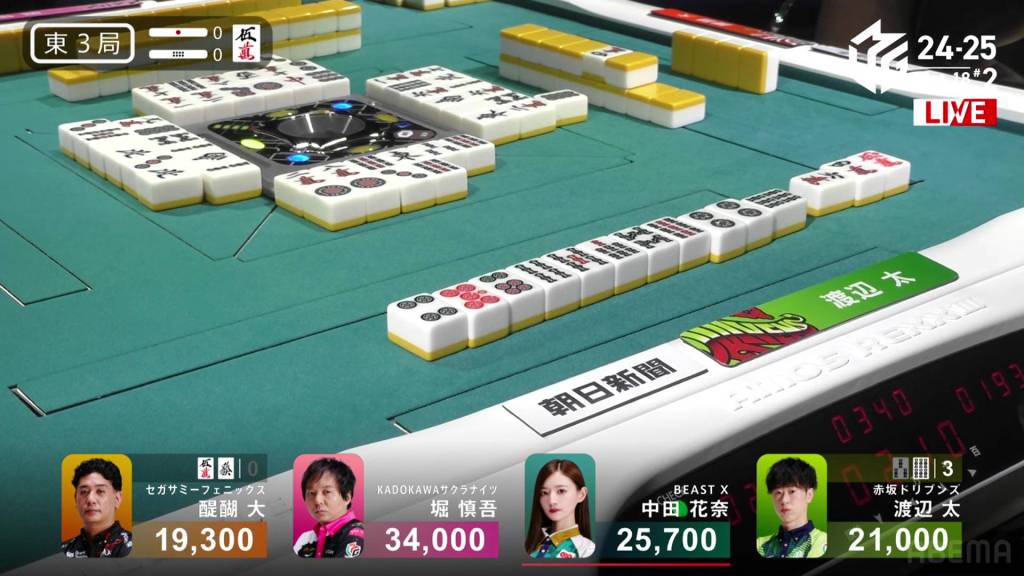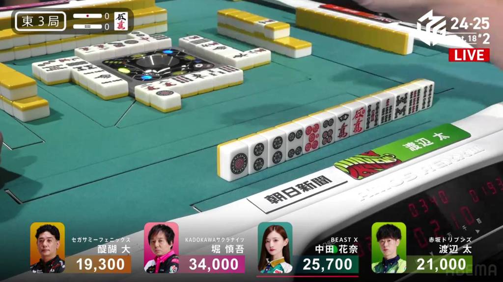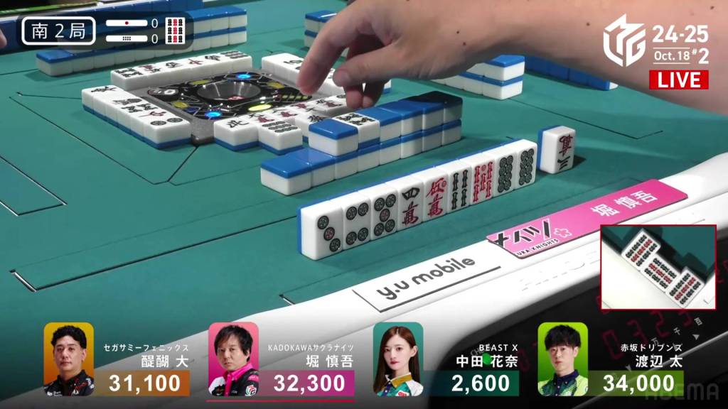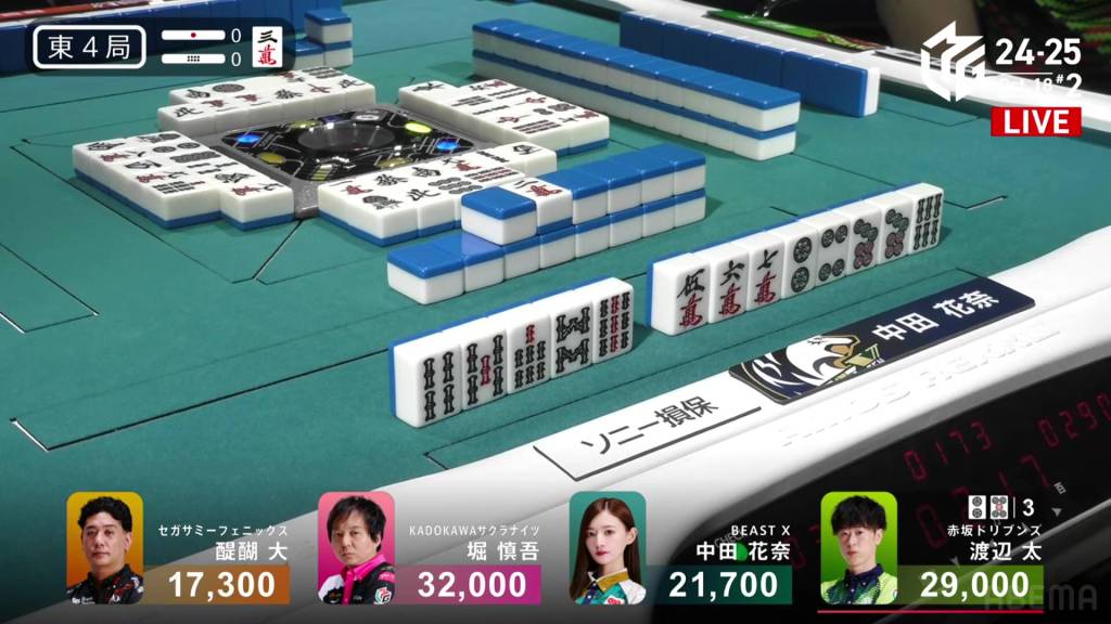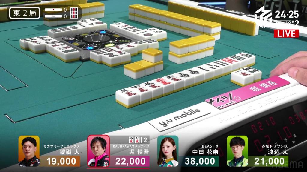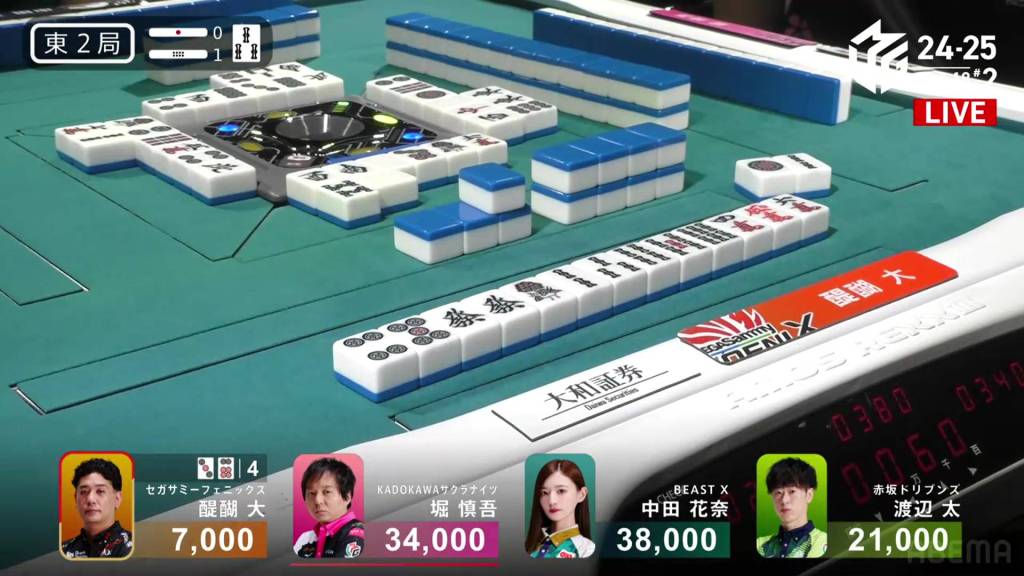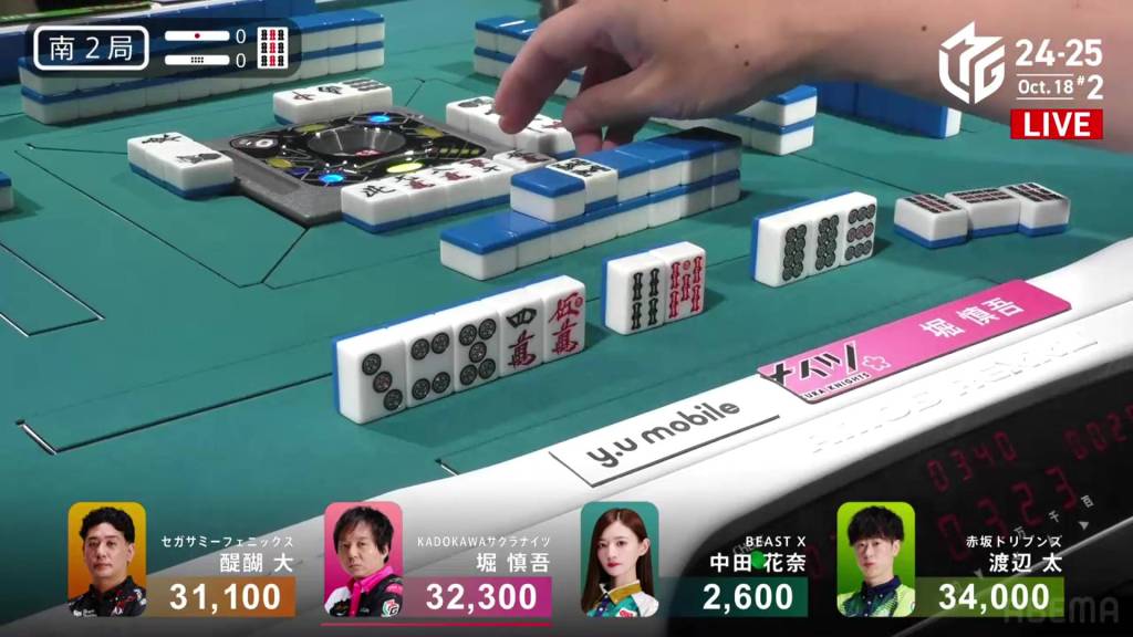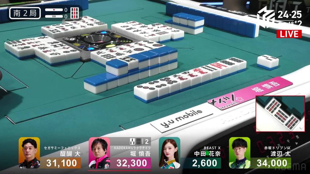 In E2-0, Hori is the dealer and looking for his fourth win in a row. After Nakada’s haneman tsumo, Hori has some work to do.