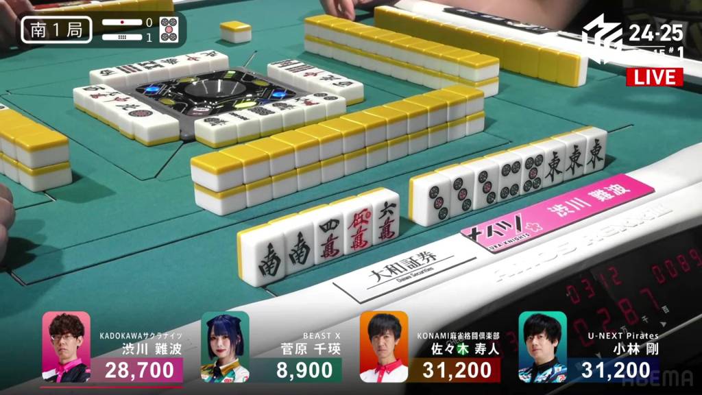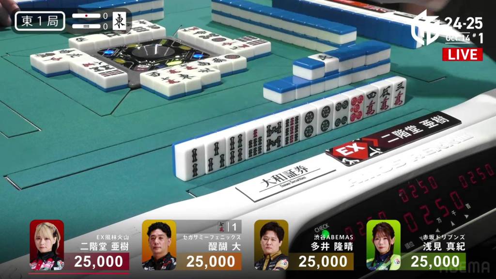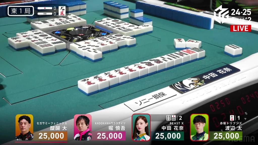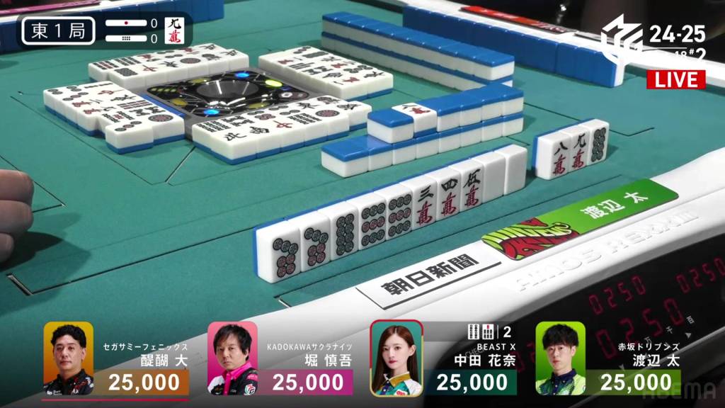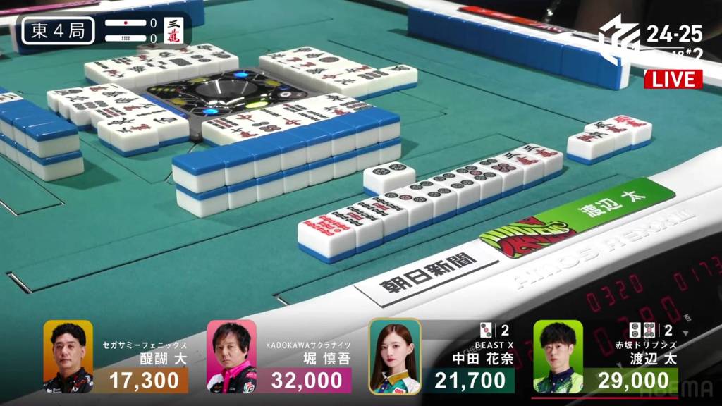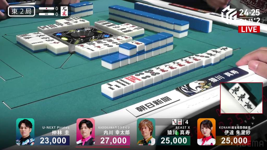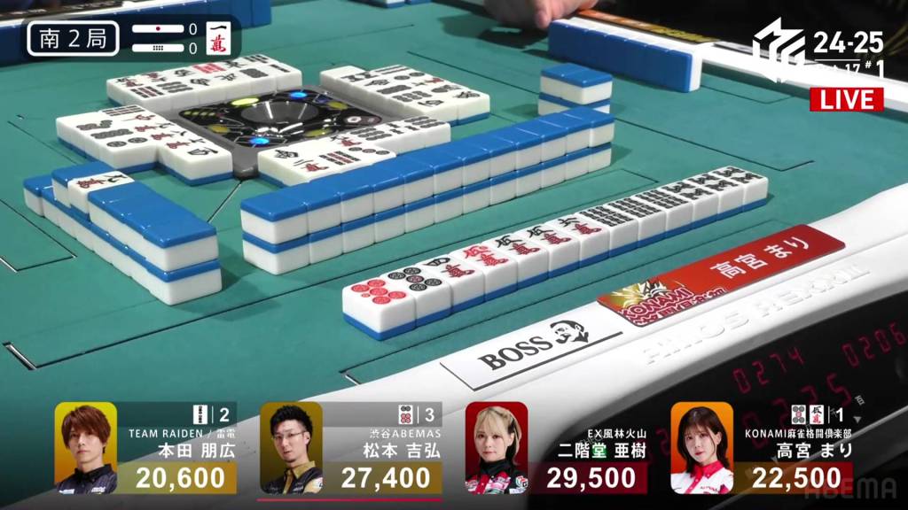 In E2-0, Hori is the dealer and looking for his fourth win in a row. After Nakada’s haneman tsumo, Hori has some work to do.