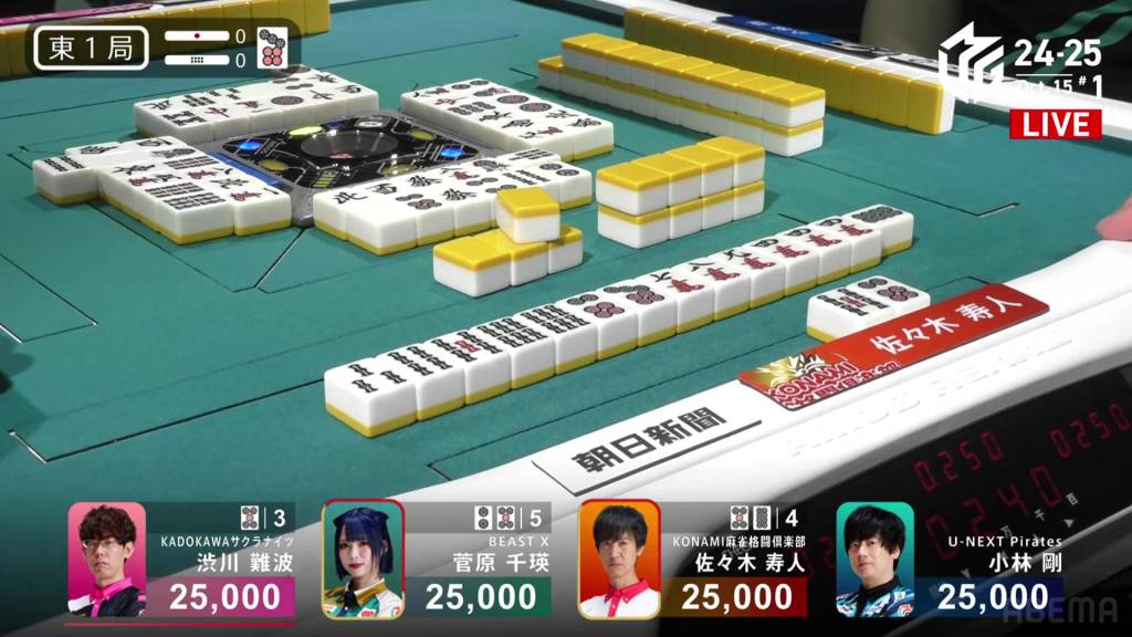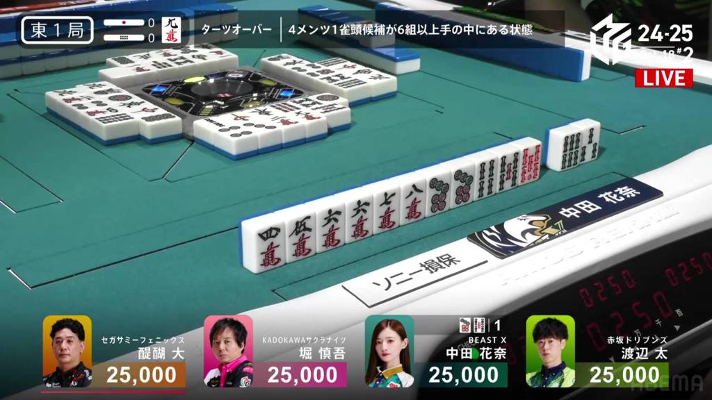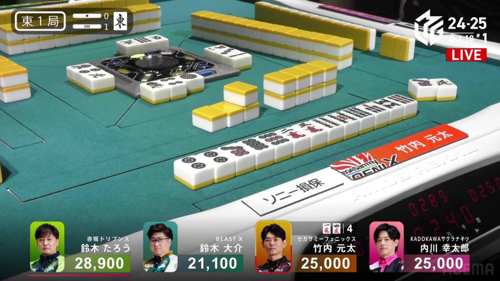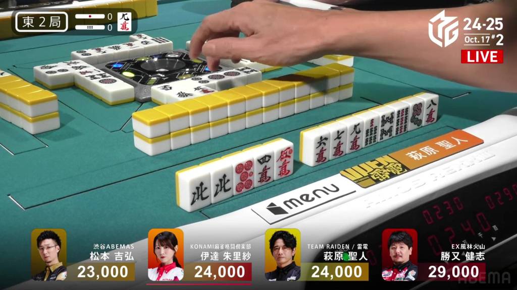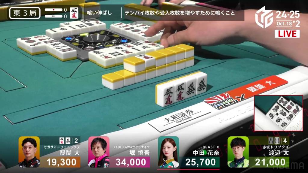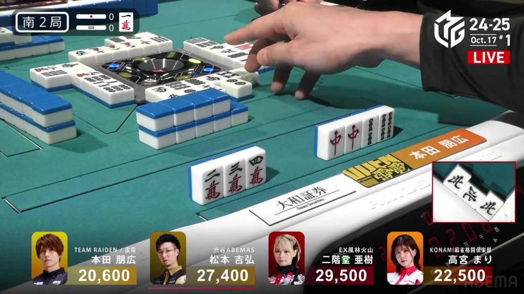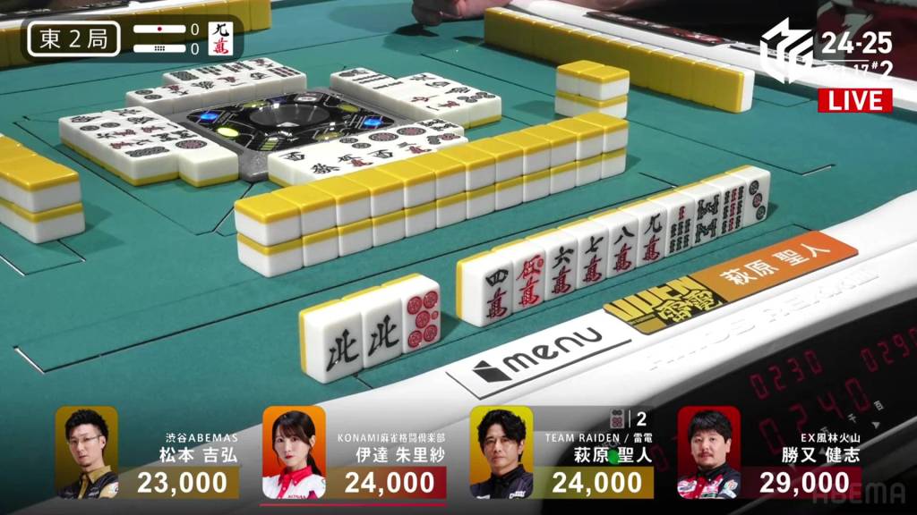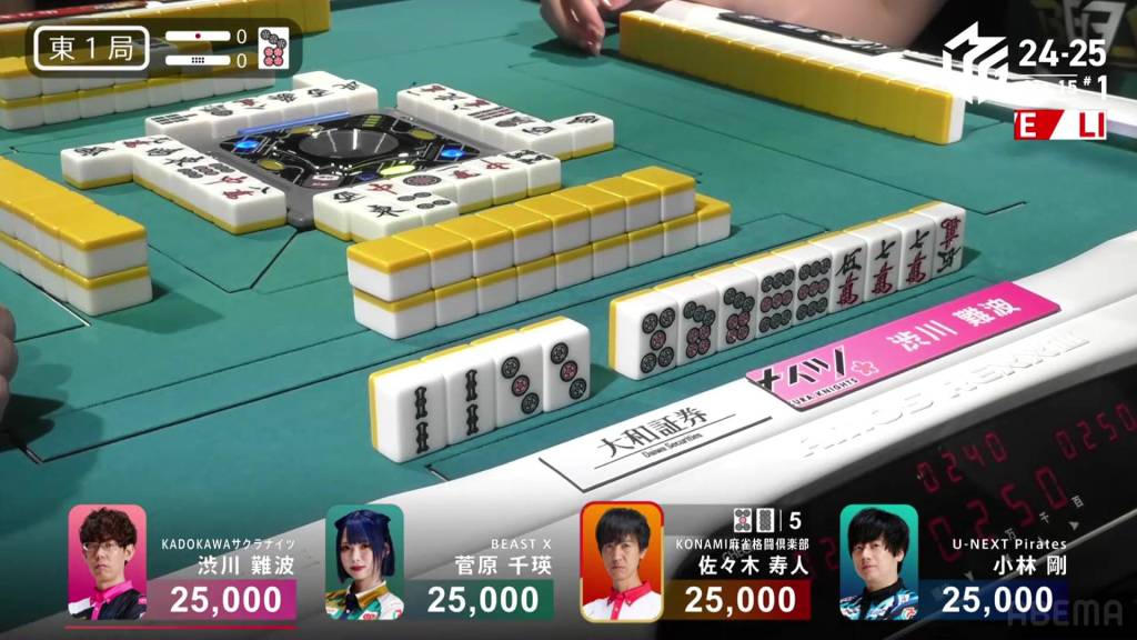In E2-0, Hori is the dealer and looking for his fourth win in a row. After Nakada’s haneman tsumo, Hori has some work to do.