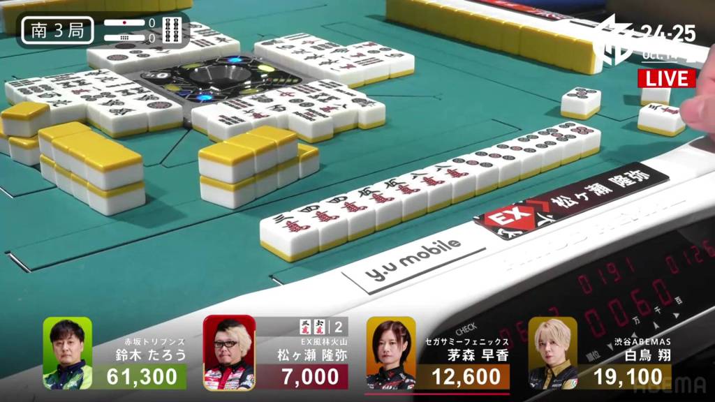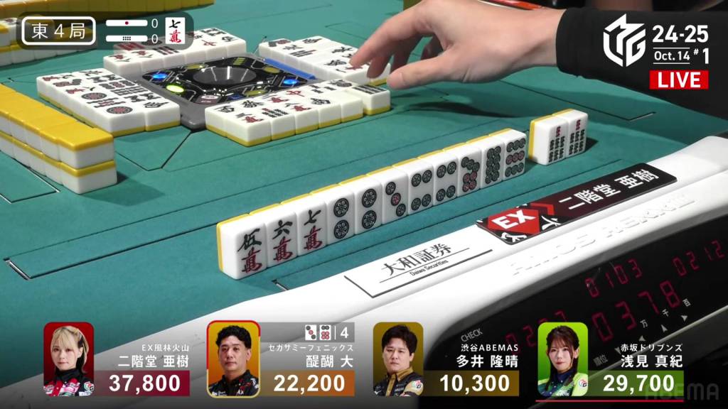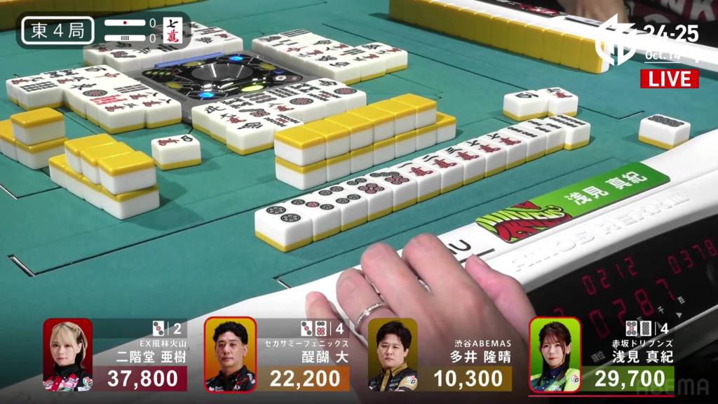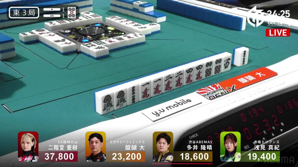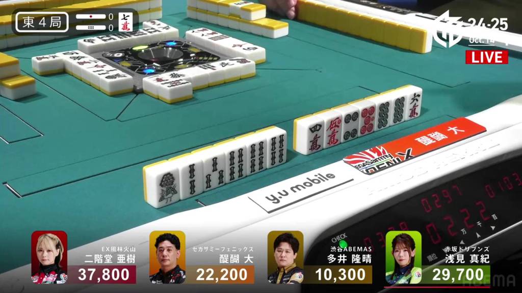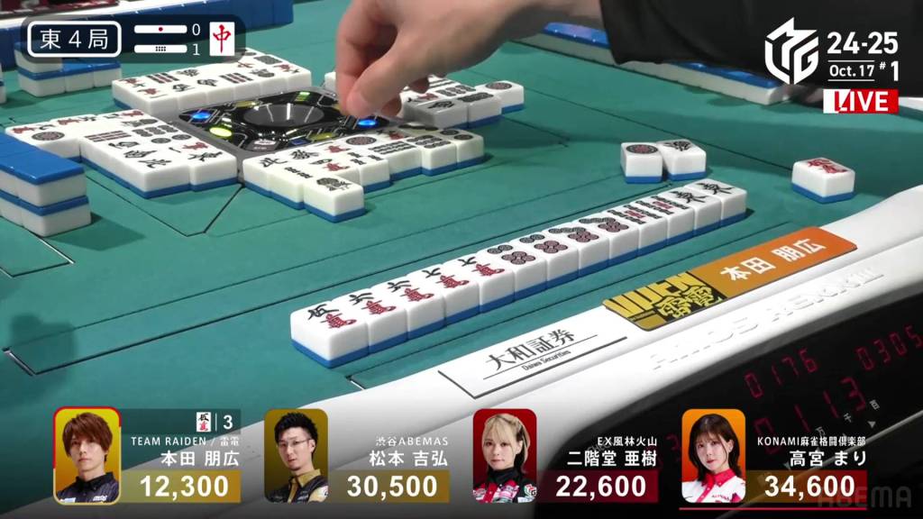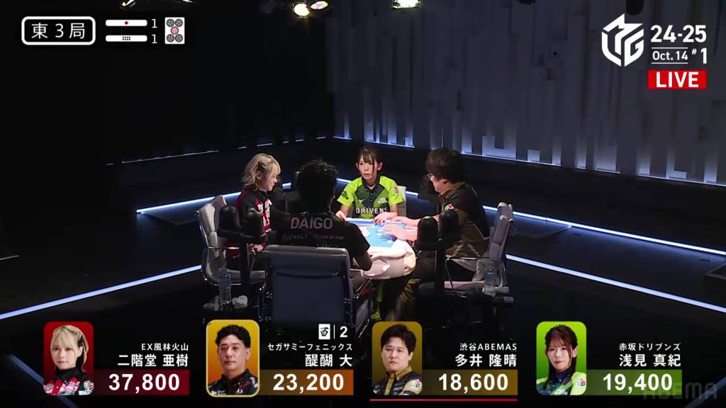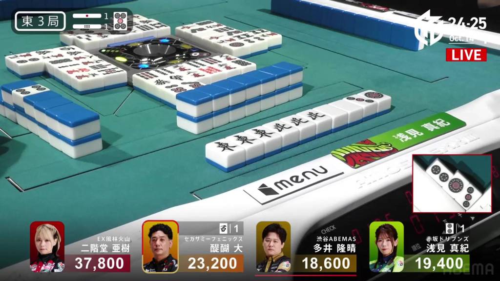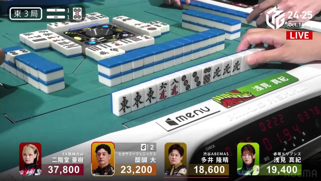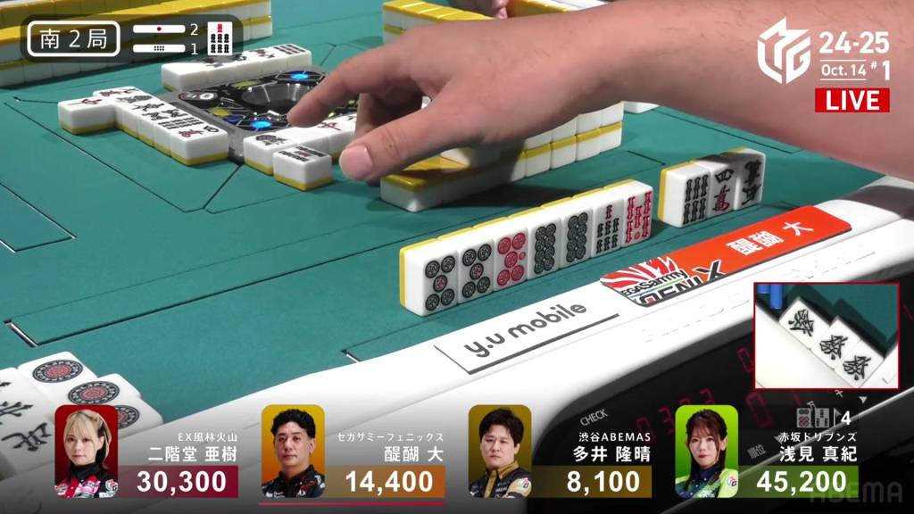 As she waits, 3rd place Daigo gets to tenpai first and calls riichi on a 36p ryanmen. With a direct hit or just one more han, he will push Asami down to 3rd place.
