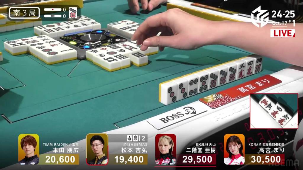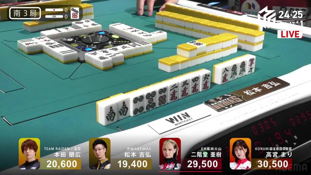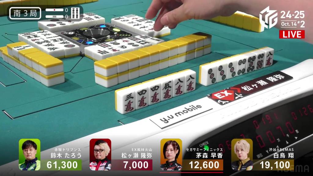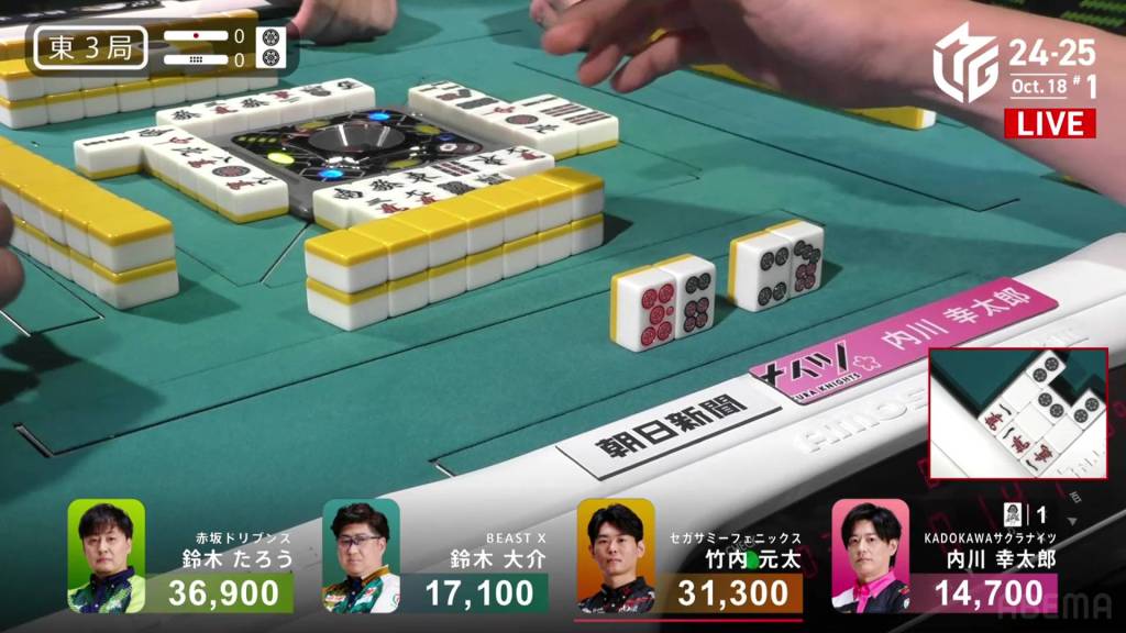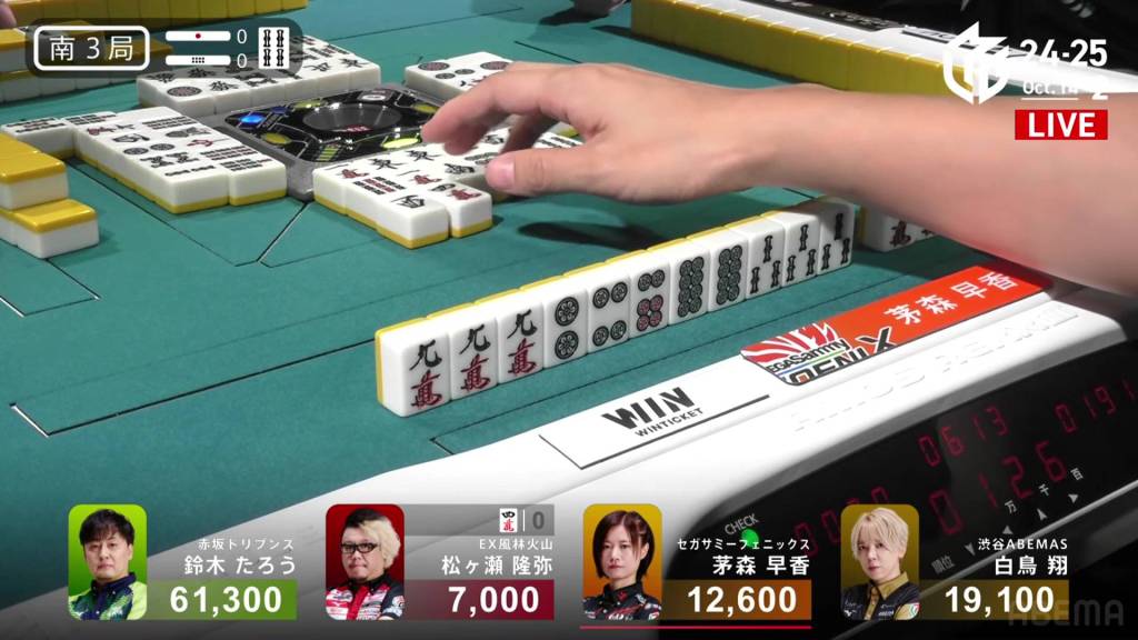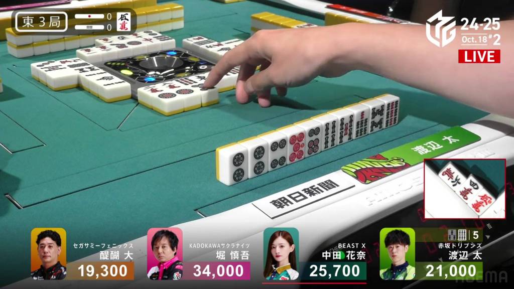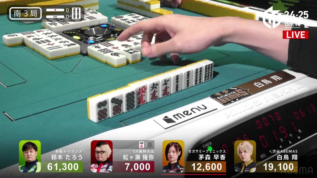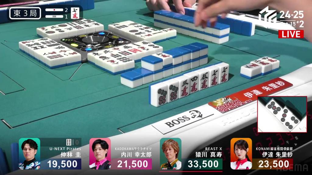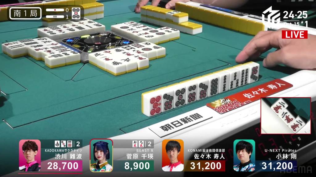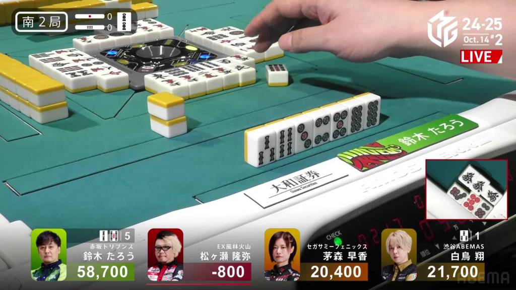 As she waits, 3rd place Daigo gets to tenpai first and calls riichi on a 36p ryanmen. With a direct hit or just one more han, he will push Asami down to 3rd place.
