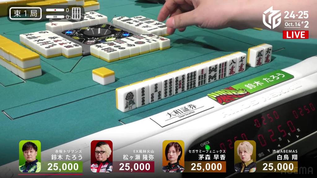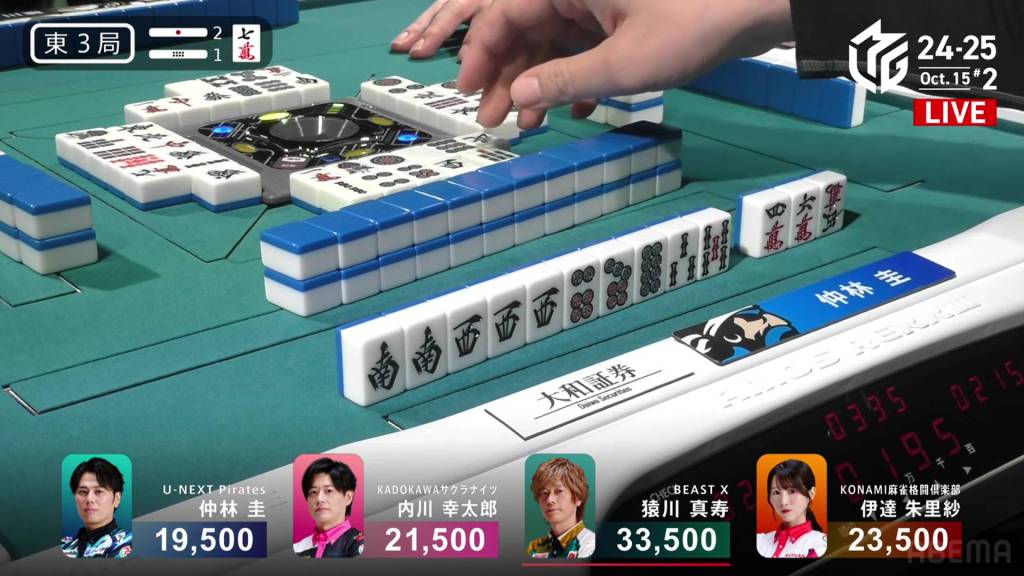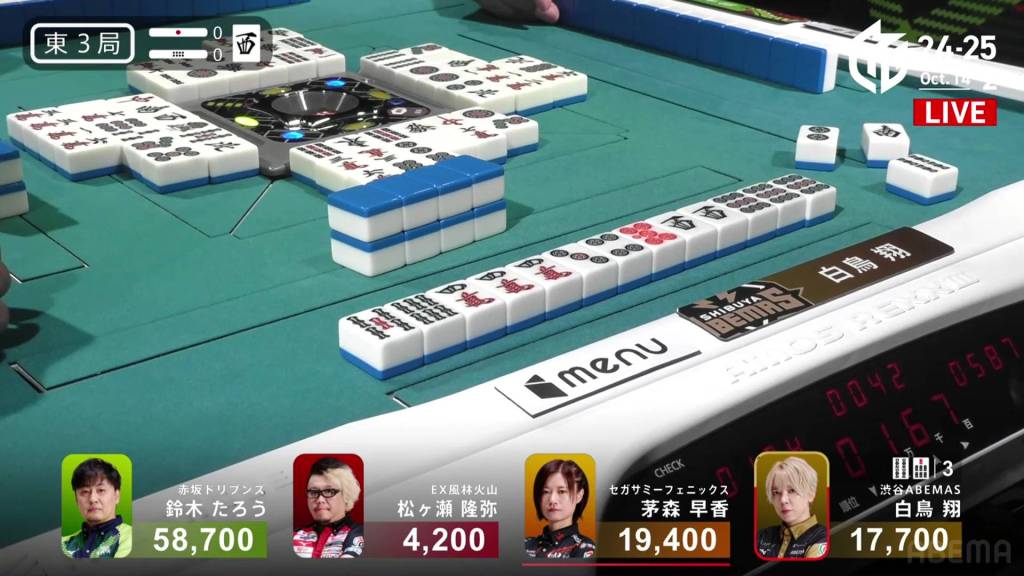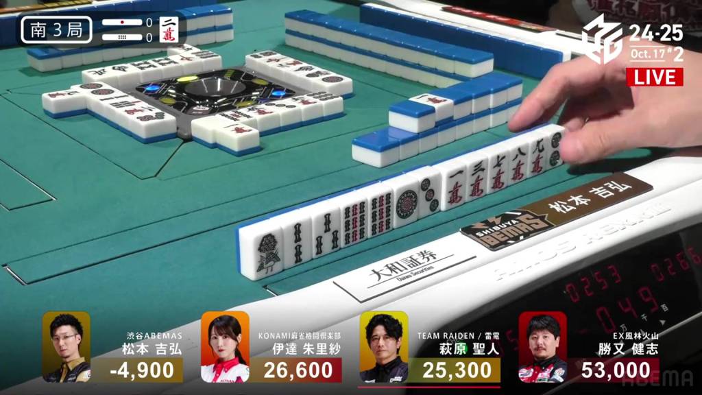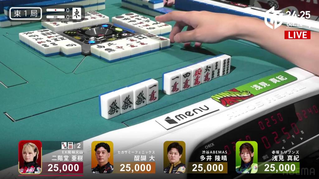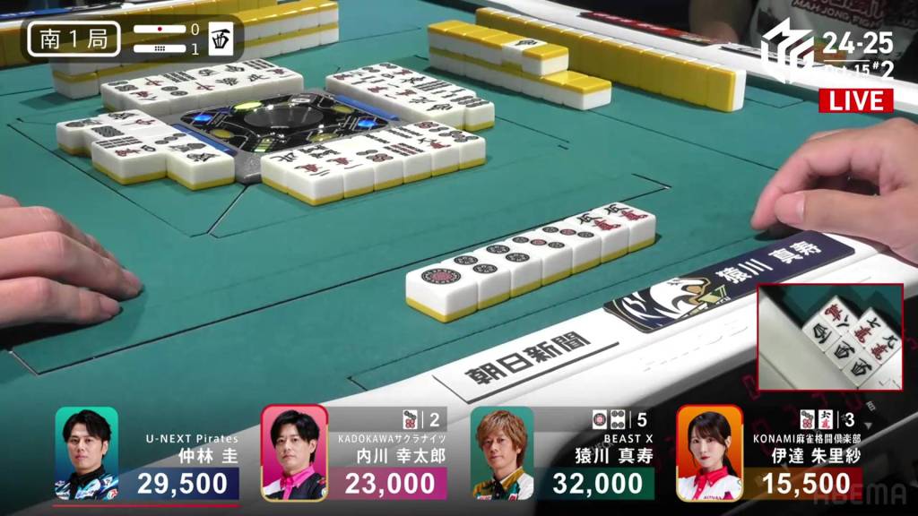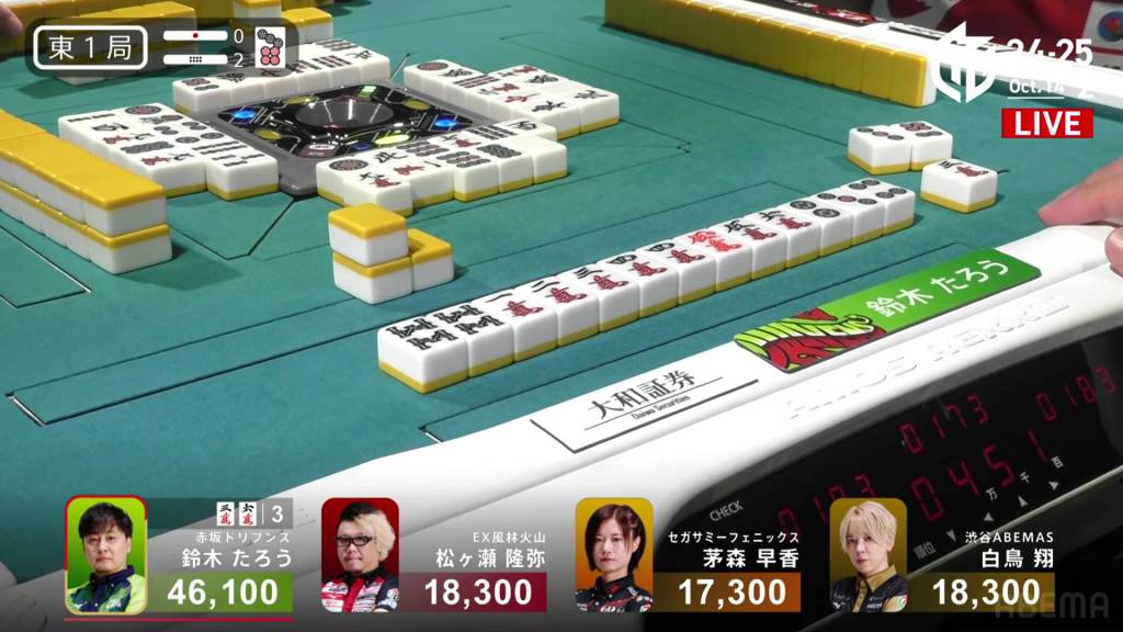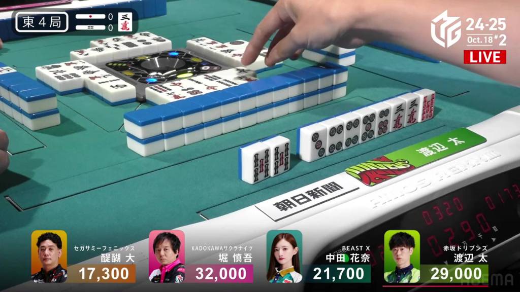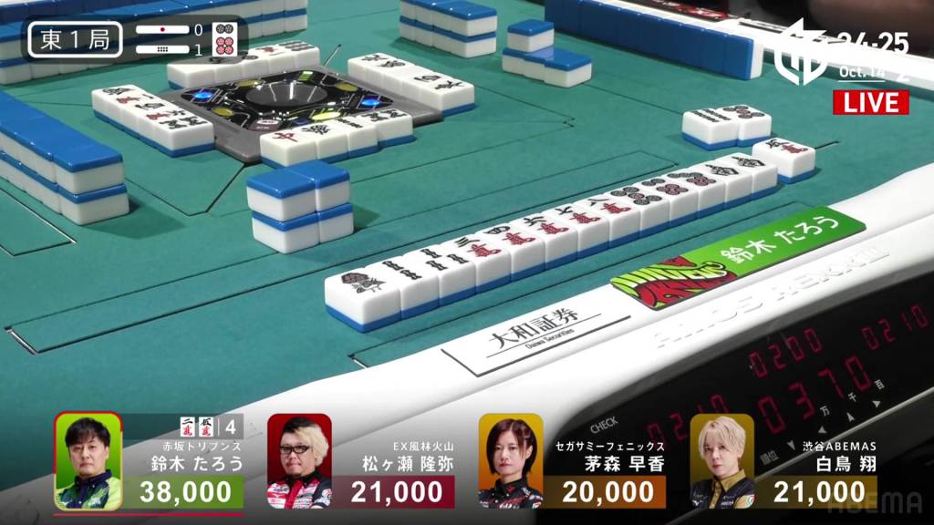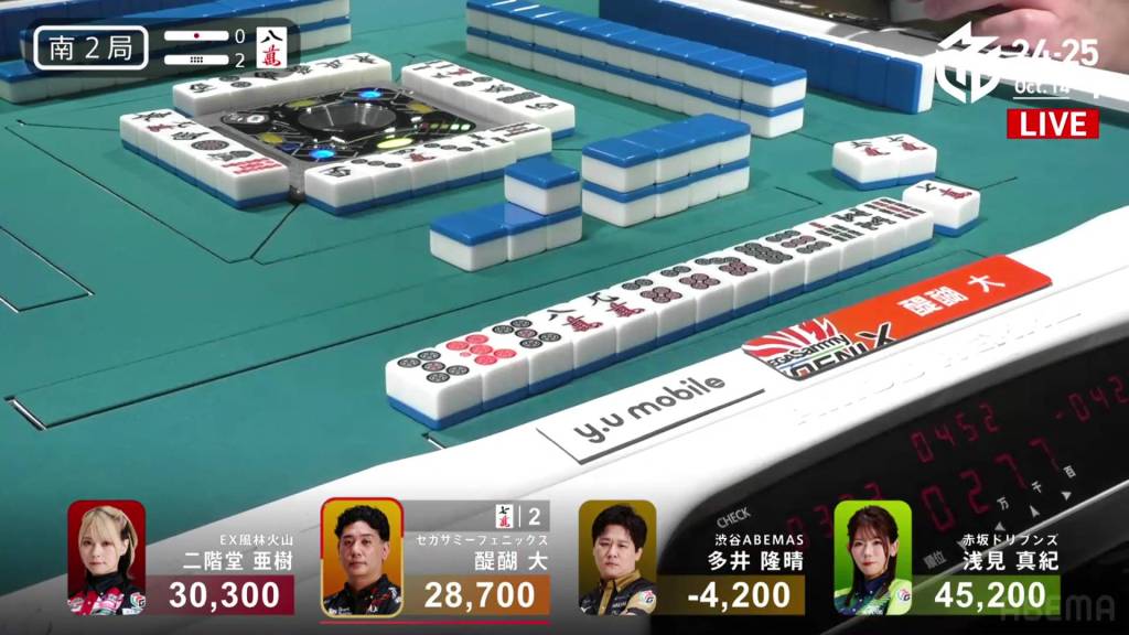 As she waits, 3rd place Daigo gets to tenpai first and calls riichi on a 36p ryanmen. With a direct hit or just one more han, he will push Asami down to 3rd place.