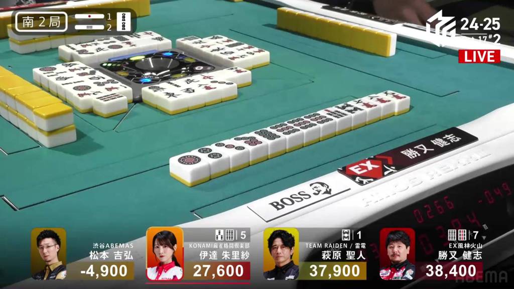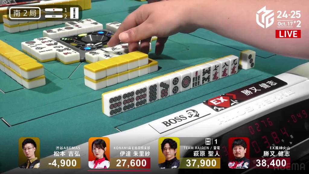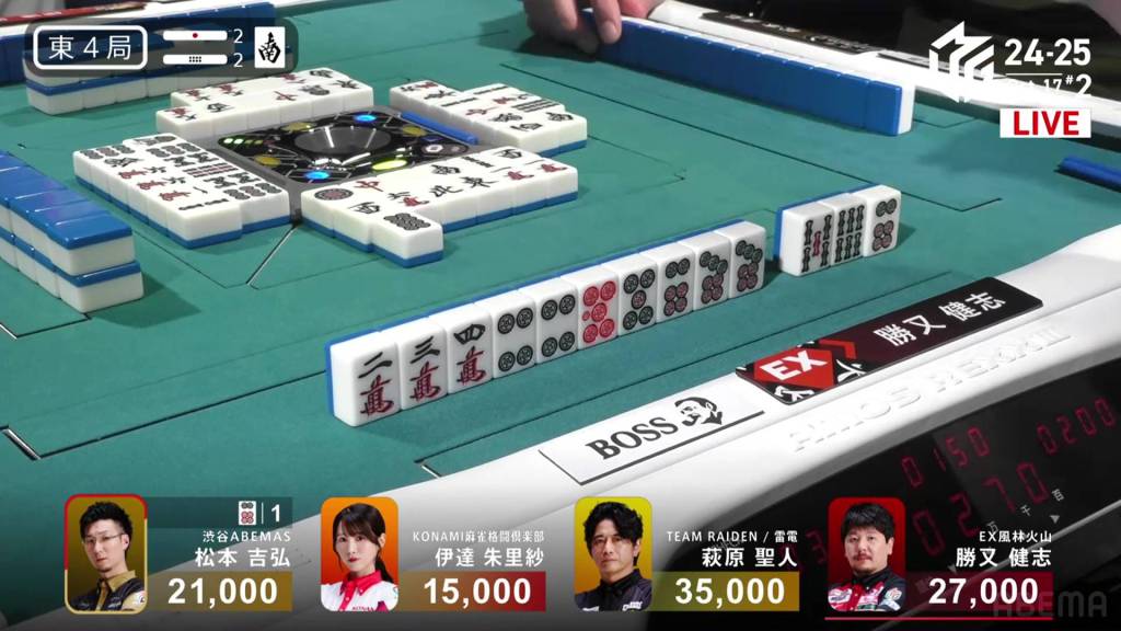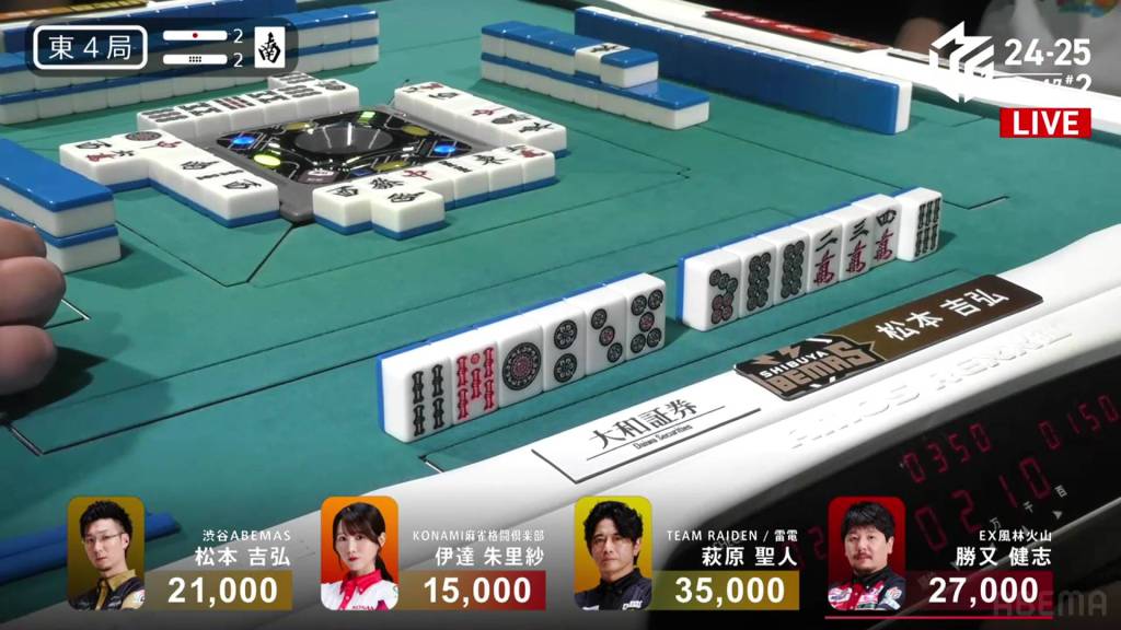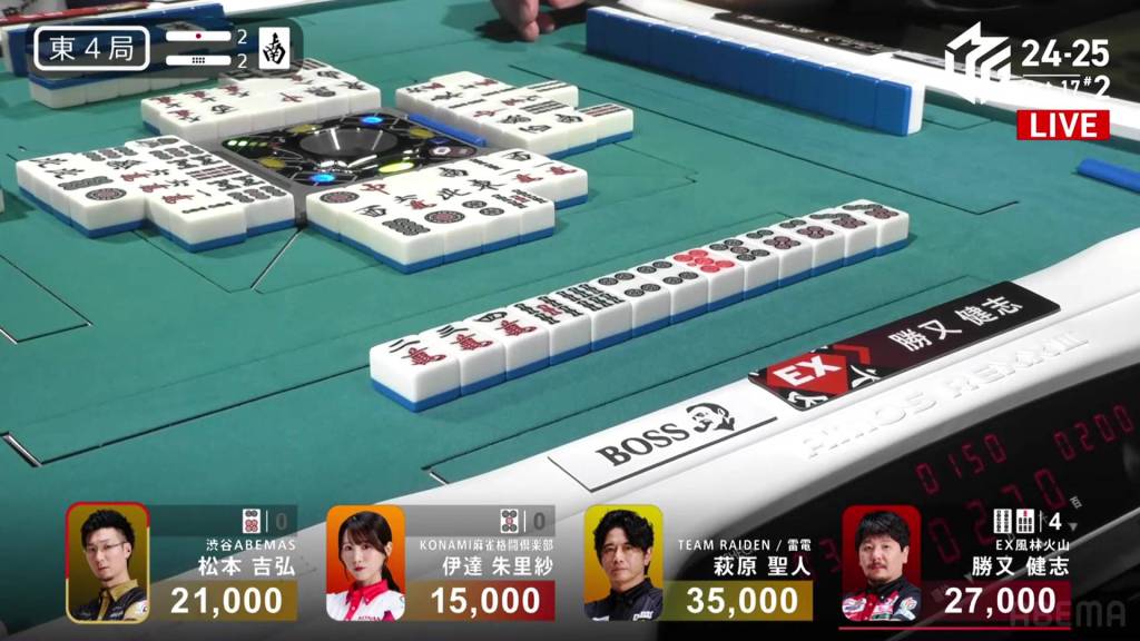 With both Date and Matsumoto holding waits with none left in the wall, they are sitting ducks against Katsumata’s four. On Matsumoto’s turn, he draws and discards the 4s and deals into Katsumata. Katsumata wins with Pinfu/Tanyao/Iipeikou/Aka 1 for 12,000+600 plus three riichi sticks, bringing Katsumata above 40,000 and into 1st place.