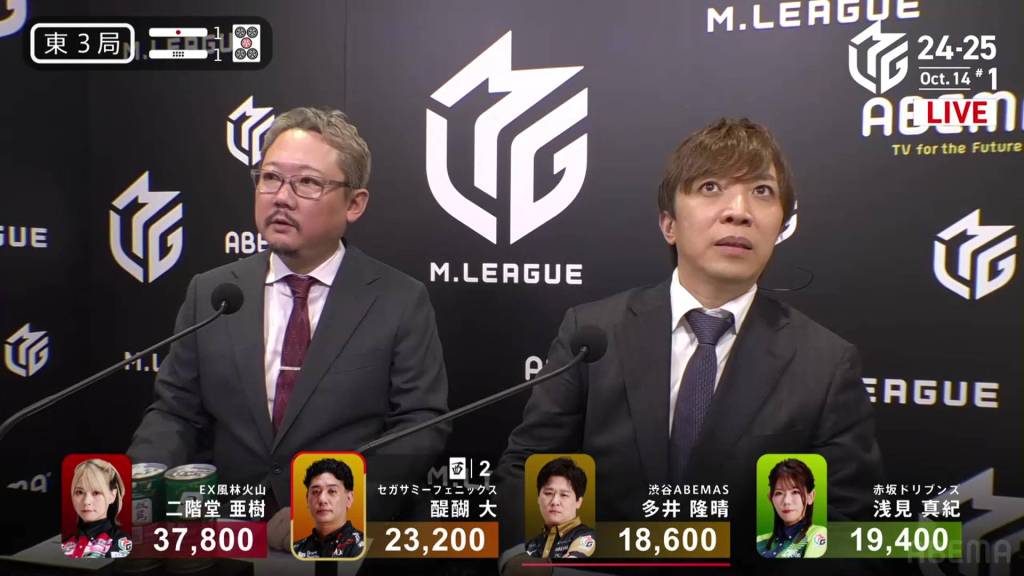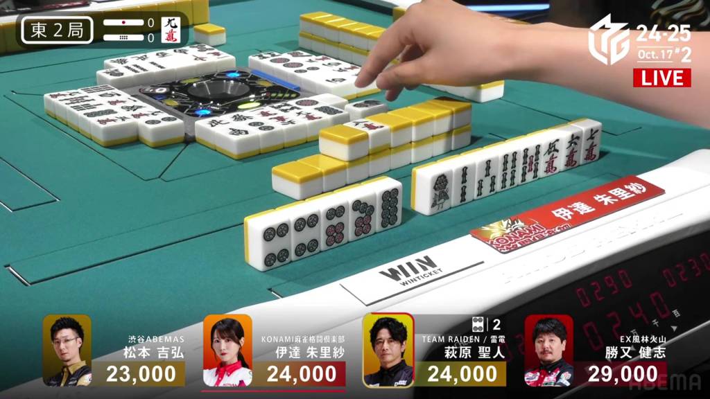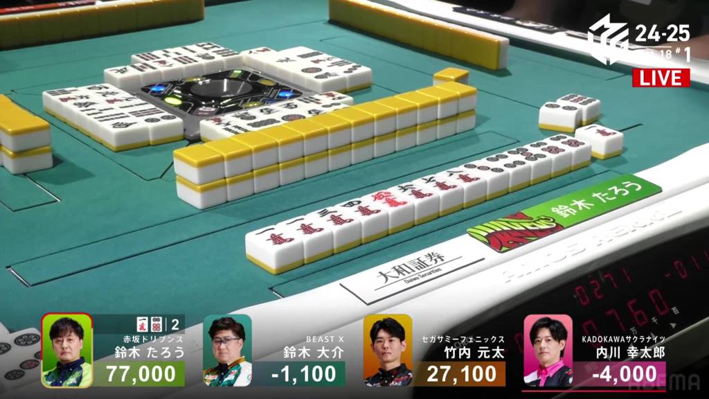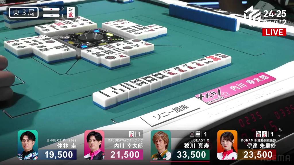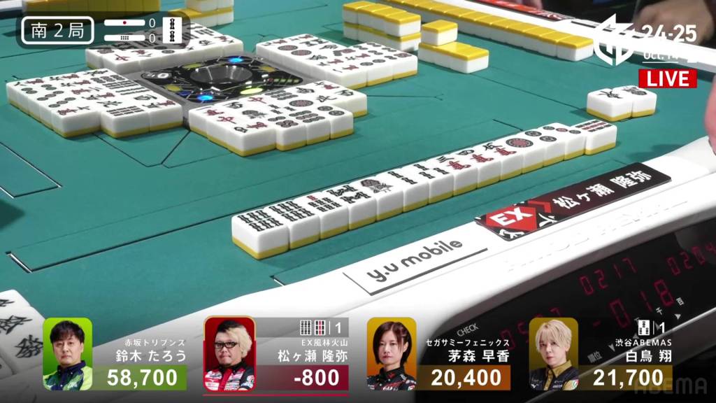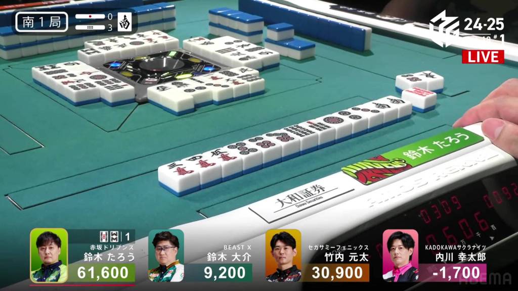 With both Date and Matsumoto holding waits with none left in the wall, they are sitting ducks against Katsumata’s four. On Matsumoto’s turn, he draws and discards the 4s and deals into Katsumata. Katsumata wins with Pinfu/Tanyao/Iipeikou/Aka 1 for 12,000+600 plus three riichi sticks, bringing Katsumata above 40,000 and into 1st place.