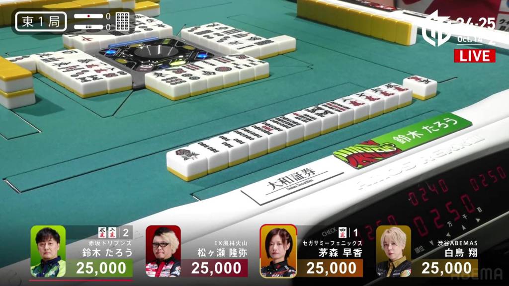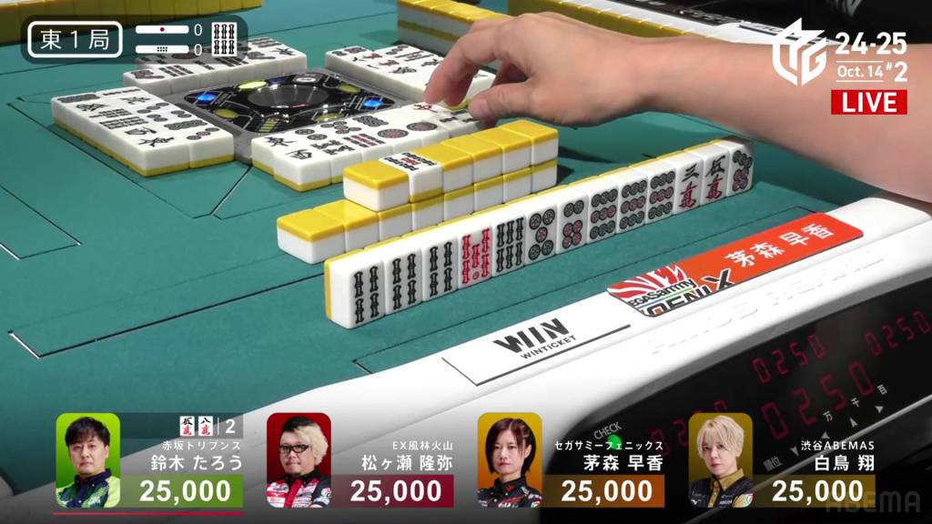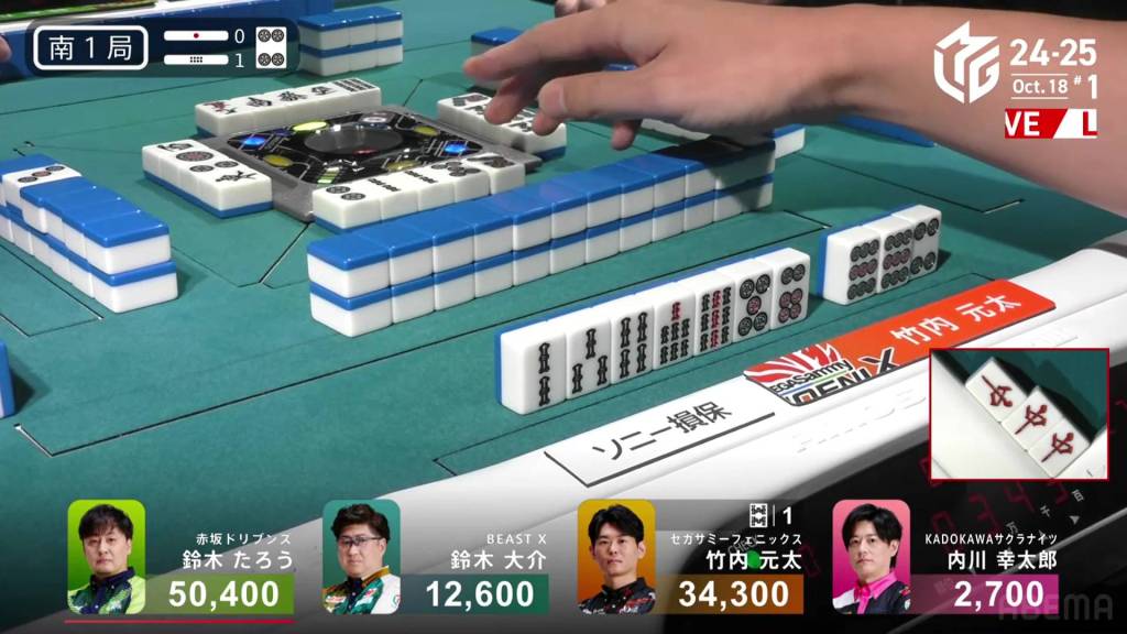 In E1-0, Hisato is in the starting west seat, looking to win the game and maybe continue his no-deal-in streak this season (currently at 49 hands).