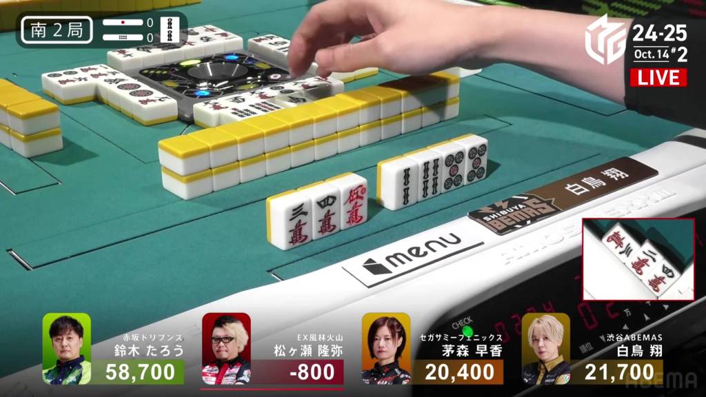 Across from him, Shiratori is trying to extend his 2nd place and move the game along. After calling chii on a 234m sequence and pon on the white dragon, he is the first to tenpai and waits on a 3s kanchan.