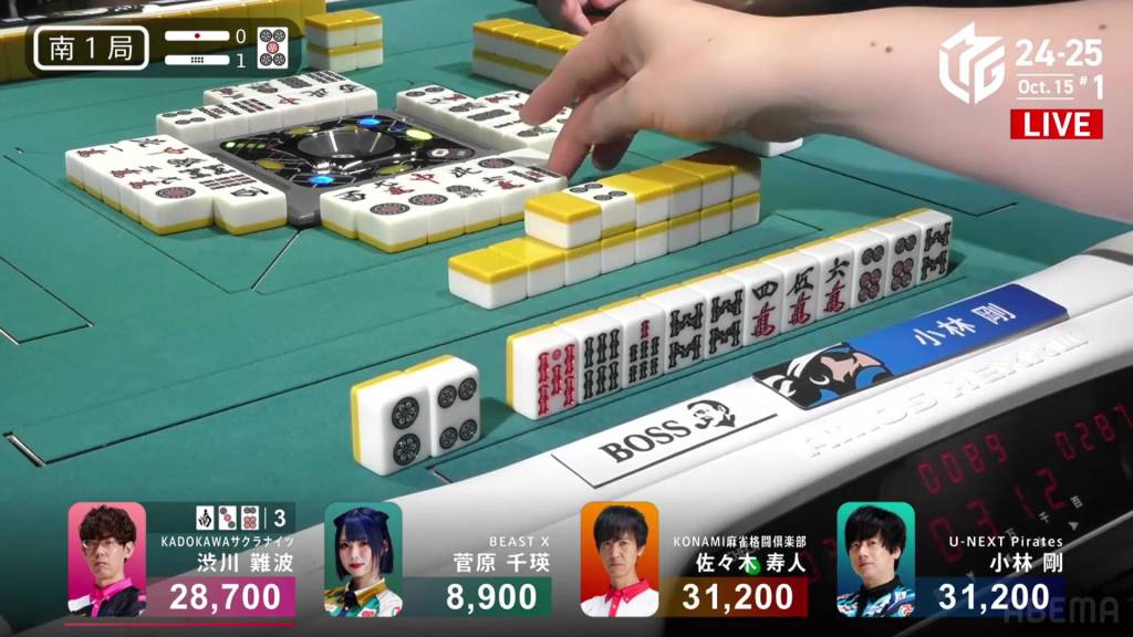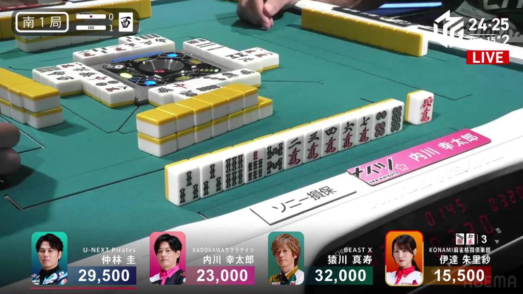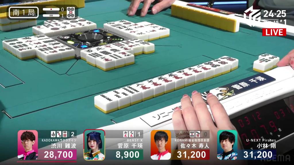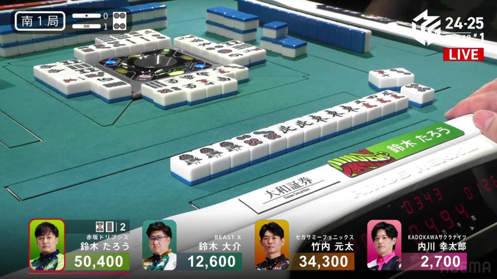 With few clues on what is safe and holding good potential value with a 789 sanshoku, Uchikawa simply pushes his iishanten hand. Throwing the 1m, he immediately deals into Genta. Genta wins the hand with Riichi/Ippatsu/Pinfu/Ura 1 for 8,000+300.
