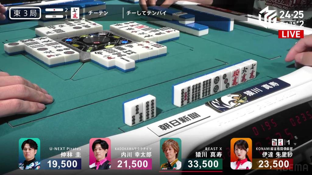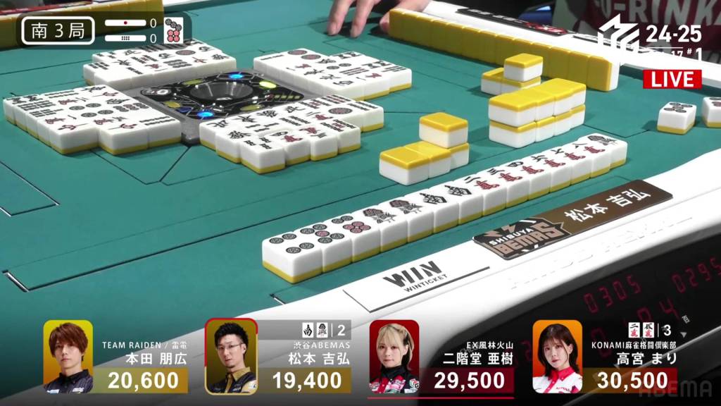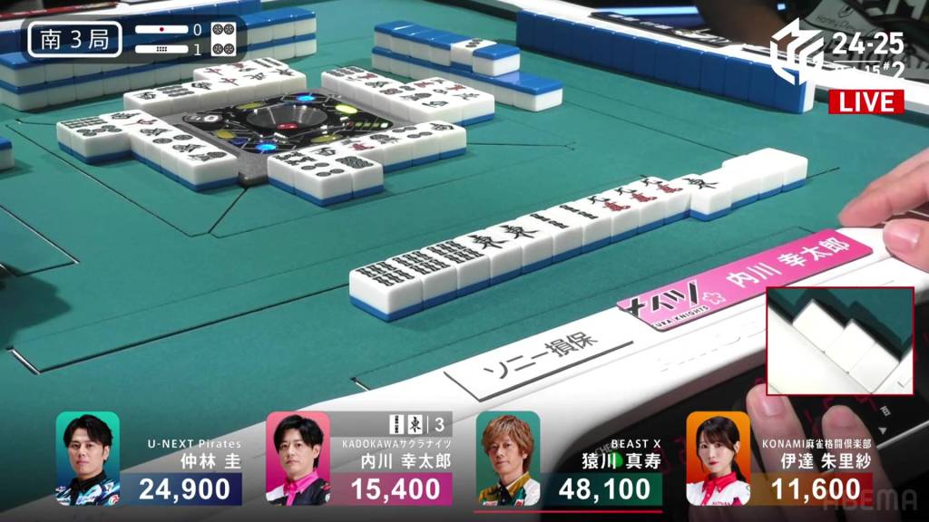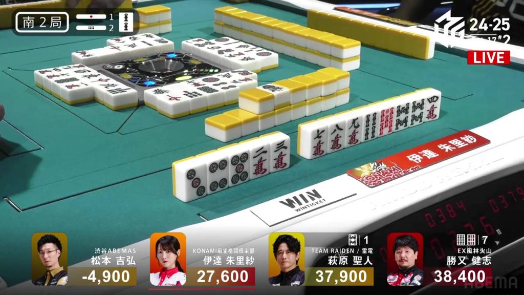 Sure enough, Matsugase draws the 3m two turns later and wins the hand. Matsugase wins with Riichi/Tsumo/Tanyao/Iipekou/Ura 1 for 2,000/4,000. With the win, he moves into 3rd place and just 2,100 from 2nd place.