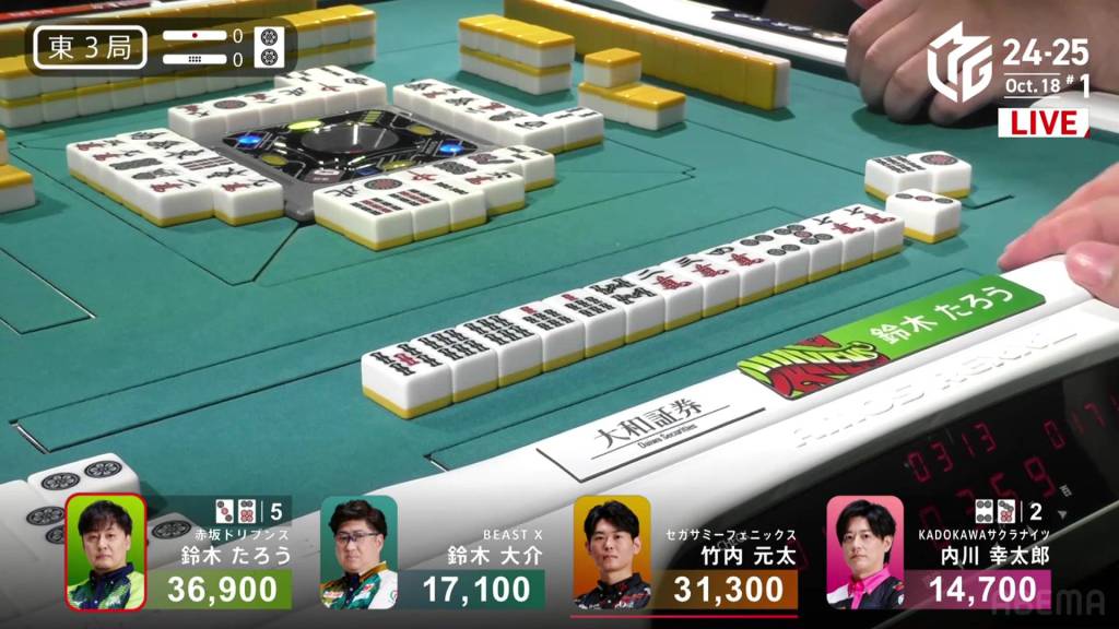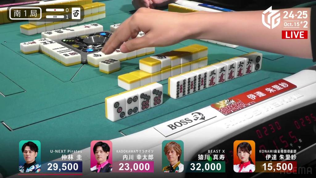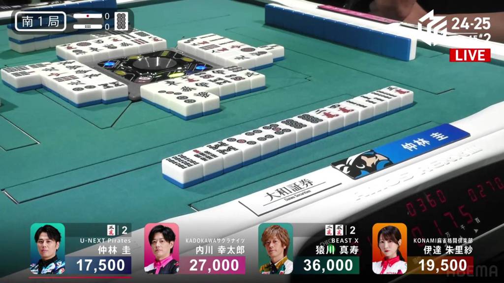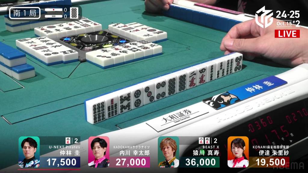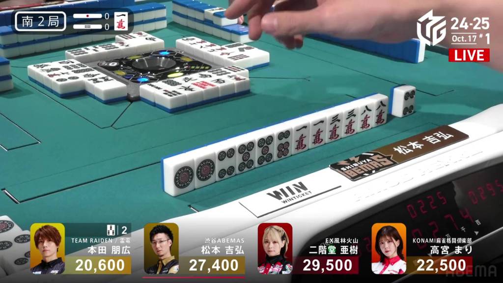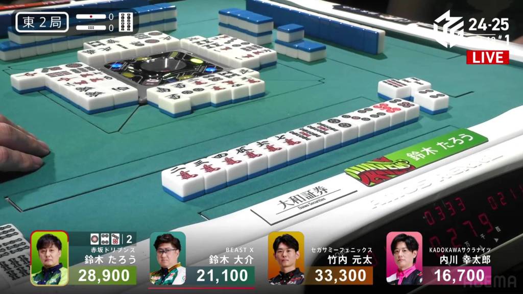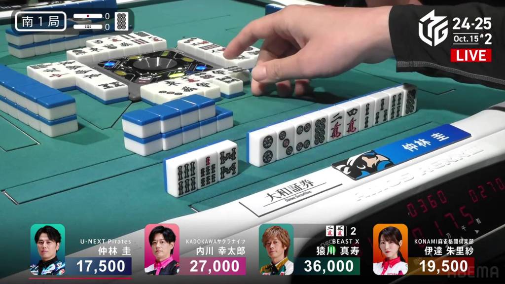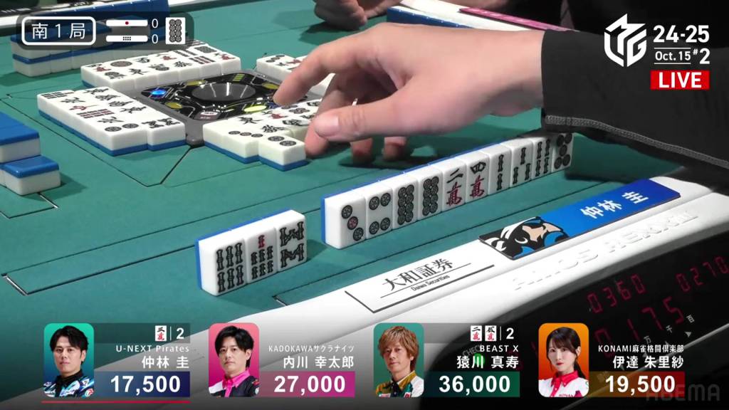 In S2-0, Hori is the dealer in 2nd place and just 1,700 behind 1st place Futoshi. Almost any hand will put him on top.