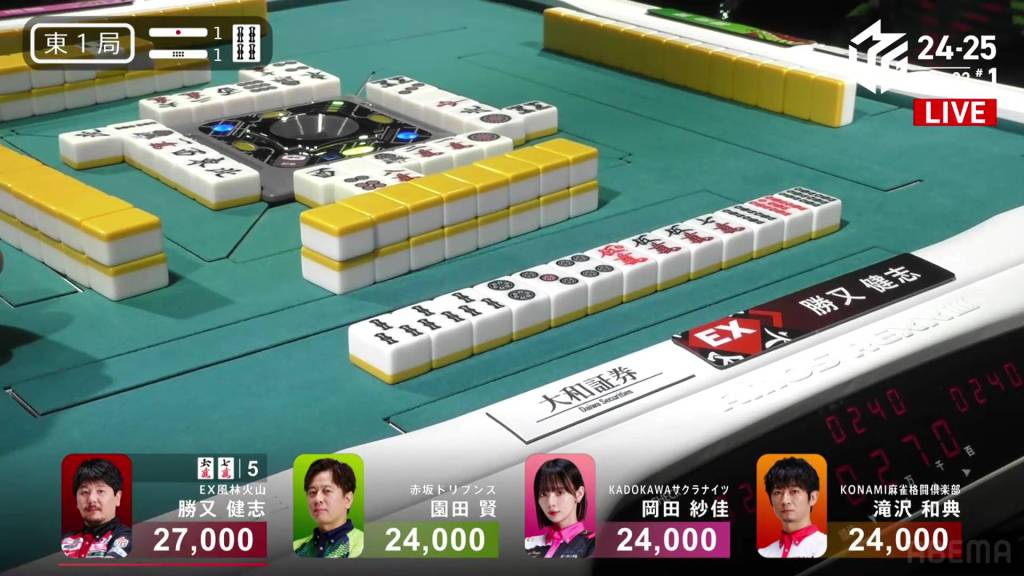 In E1-1, Katsumata is the dealer in 1st place after calling riichi and being the only one tenpai the previous hand.
