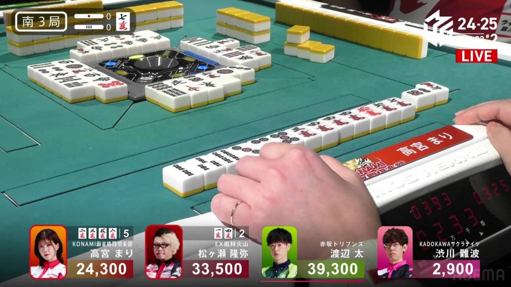 In S3-0, Takamiya is in 3rd place, an annoying position considering that she was in 1st place just two hands earlier. Nos, she sits 9,200 behind 2nd place Matsugase and 15,000 behind 1st place Futoshi.