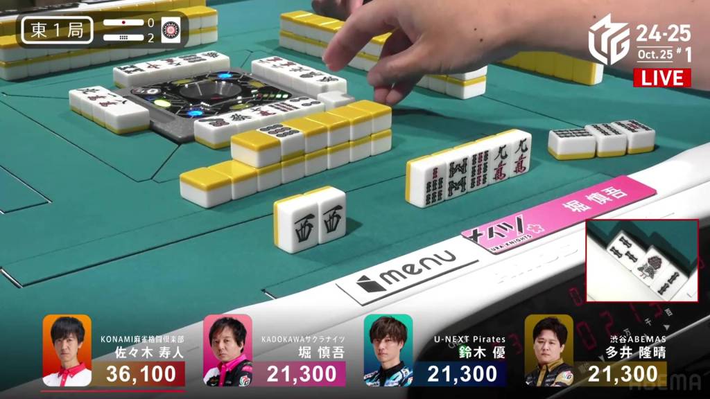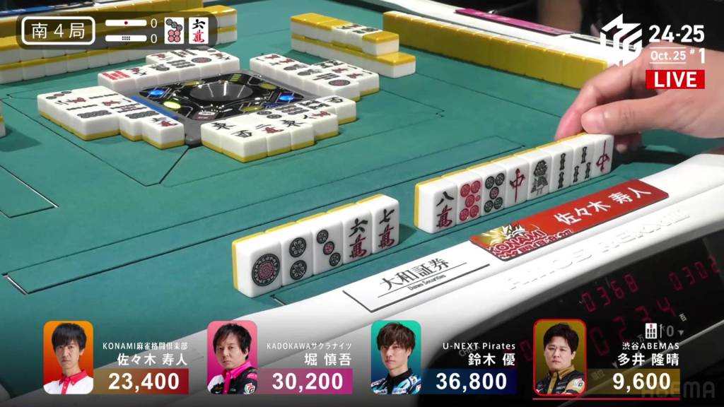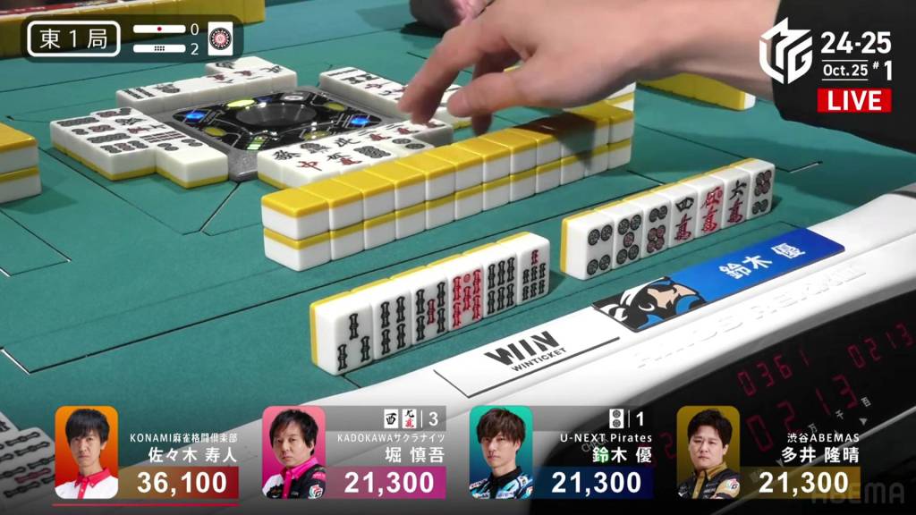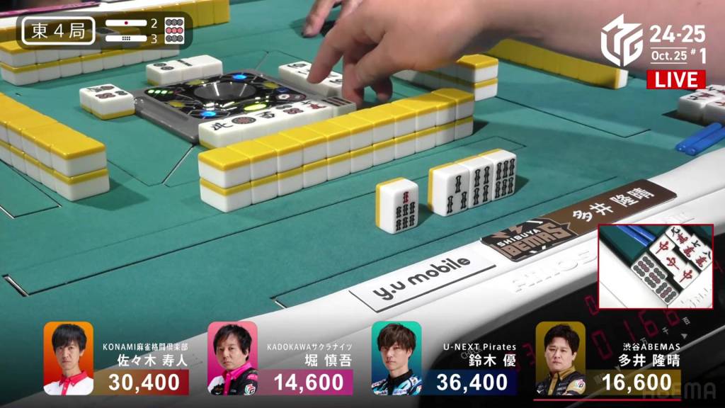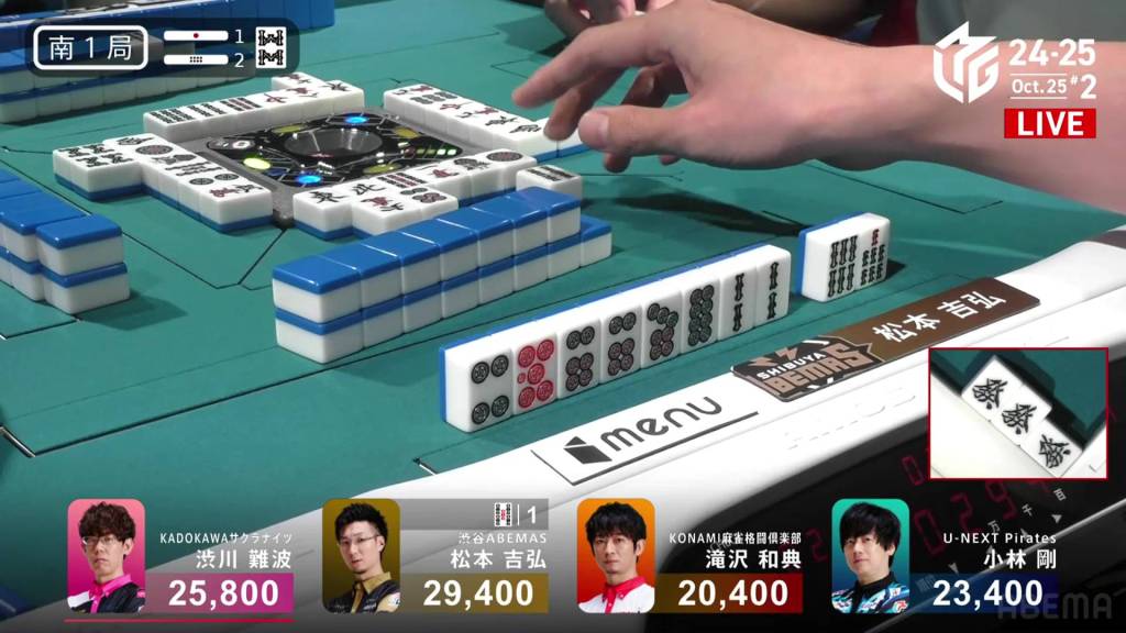 In the second row, Matsumoto is the first player to make noise. With a pon on the green dragon, he is the first to tenpai and waits on a 5s kanchan. Soon after, he upgrades it to a 58s ryanmen.