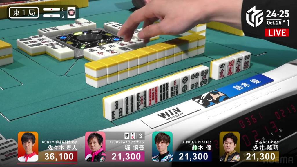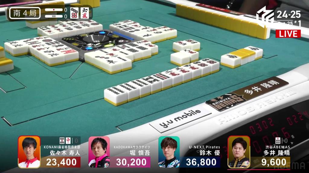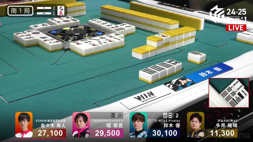 In S1-1, Yu is still in 1st place, but his lead has shrunk all the way down to just 600. Two riichi sticks and a honba are in the pot.