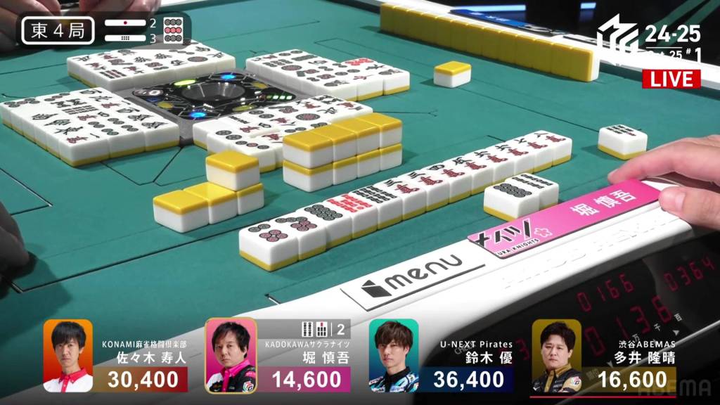In E4-3, Hori is in 4th place, 2,000 behind 3rd place Ooi and 15,800 behind 2nd place Hisato. The last hand went to a draw, so now there are two riichi sticks and three honba in the pot.