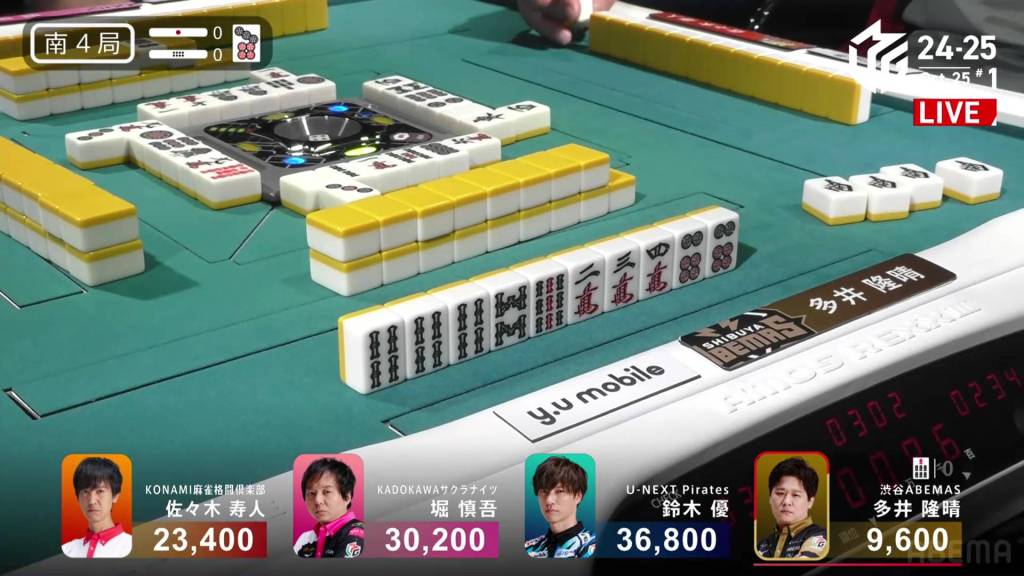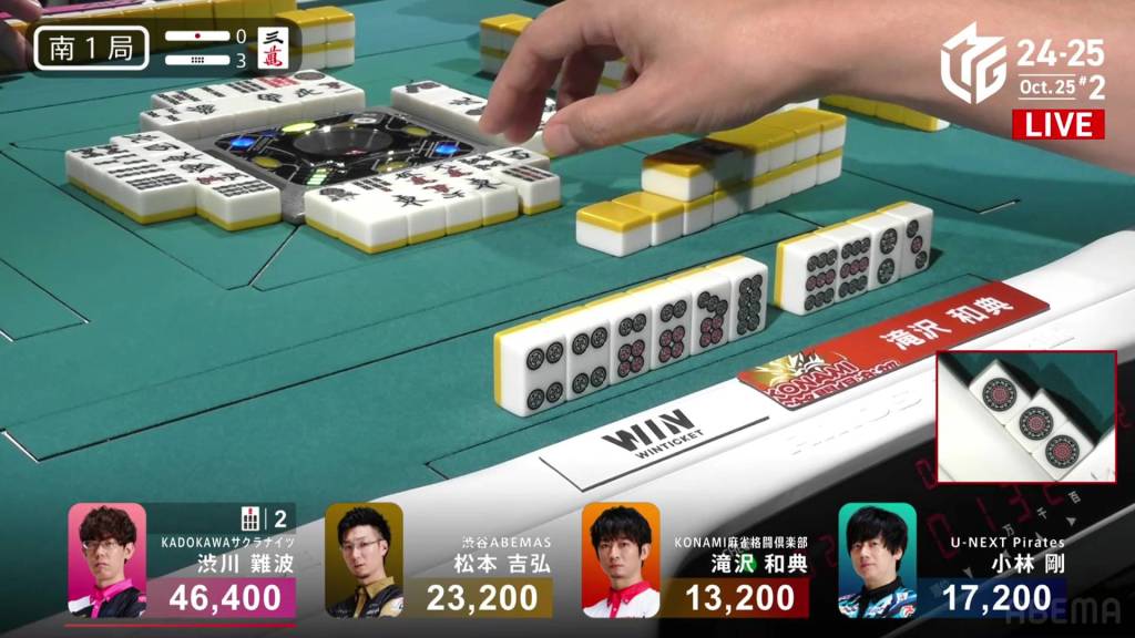 However, Takizawa’s riichi is merely a donation to Shibukawa. On Shibukawa’s ippatsu draw, he gets the 6m and wins the hand. Shibukawa wins with Riichi/Ippatsu/Tsumo/Pinfu/Sanshoku for 6,000+200 all plus two riichi sticks to move him to 46,400.