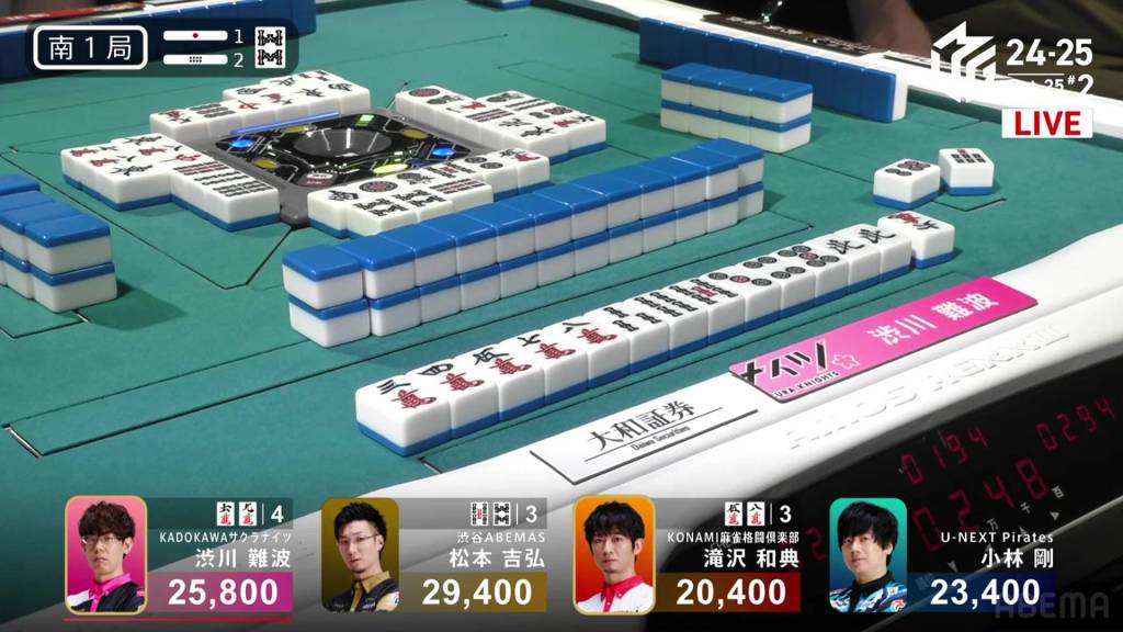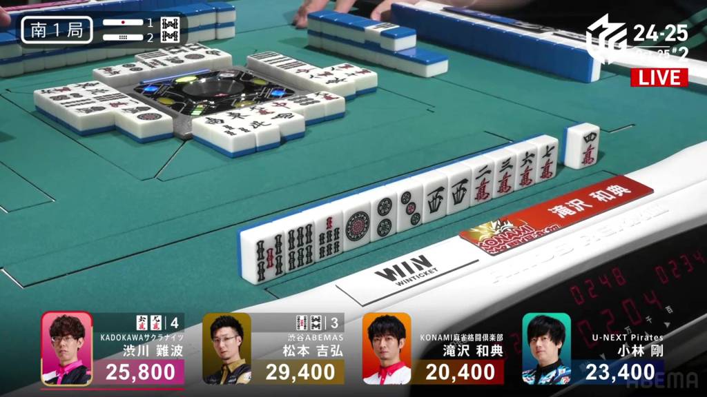 In S1-2, Shibukawa is the dealer in 2nd place, 3,600 behind 1st place Matsumoto. 1,600 in bonuses await the next winner.