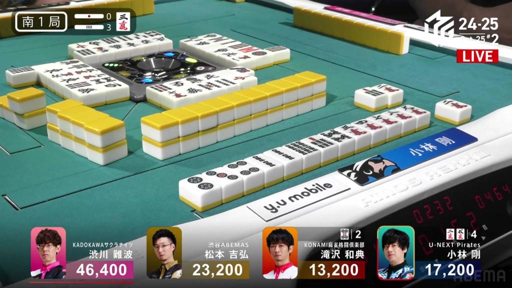 In the second row, Kobayashi’s shapes start to improve, but he can’t quite match the speed of the others. Near the middle of the row, Shibukawa (who has a pair of 3m dora) is the first to tenpai and waits on a 7s penchan.