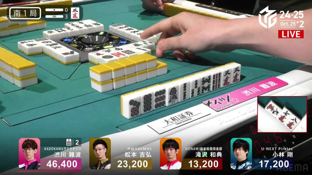 Luckily for Shibukawa, he discarded the 8s before Matsumoto upgraded his wait. On Shibukawa’s next draw, he gets the ideal 3p and calls riichi on a 69m ryanmen, guaranteed at least a dealer mangan if he wins.