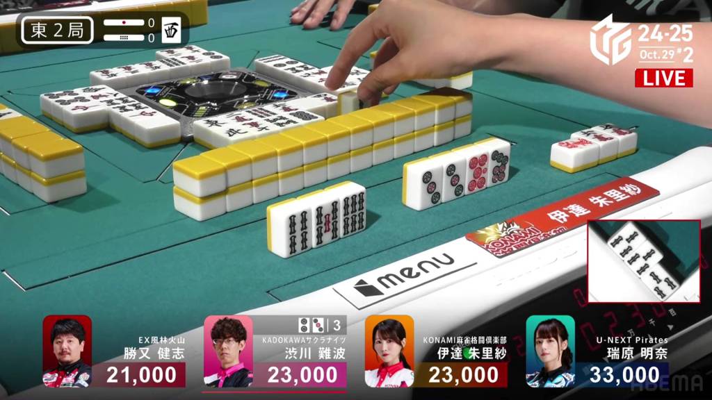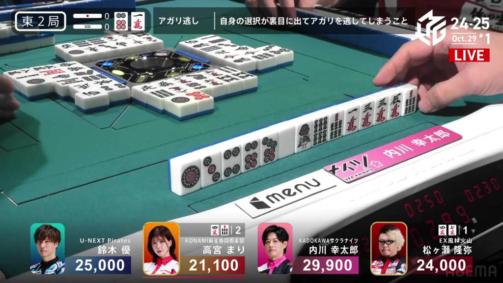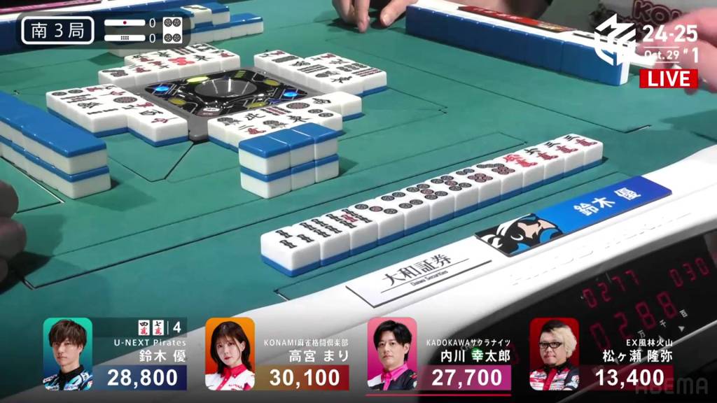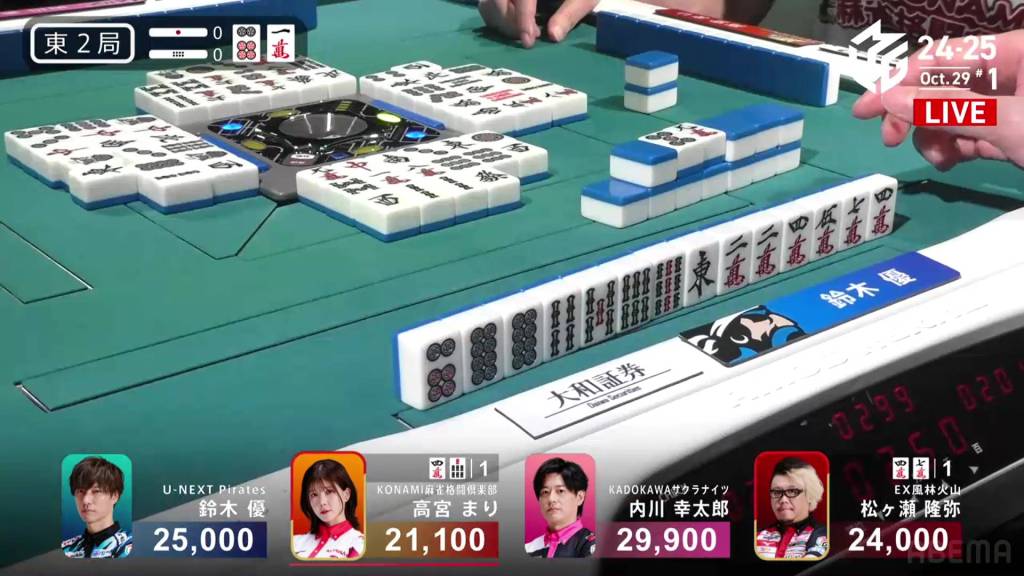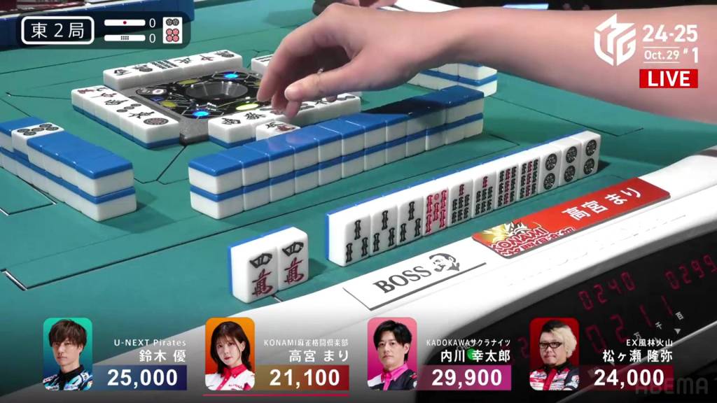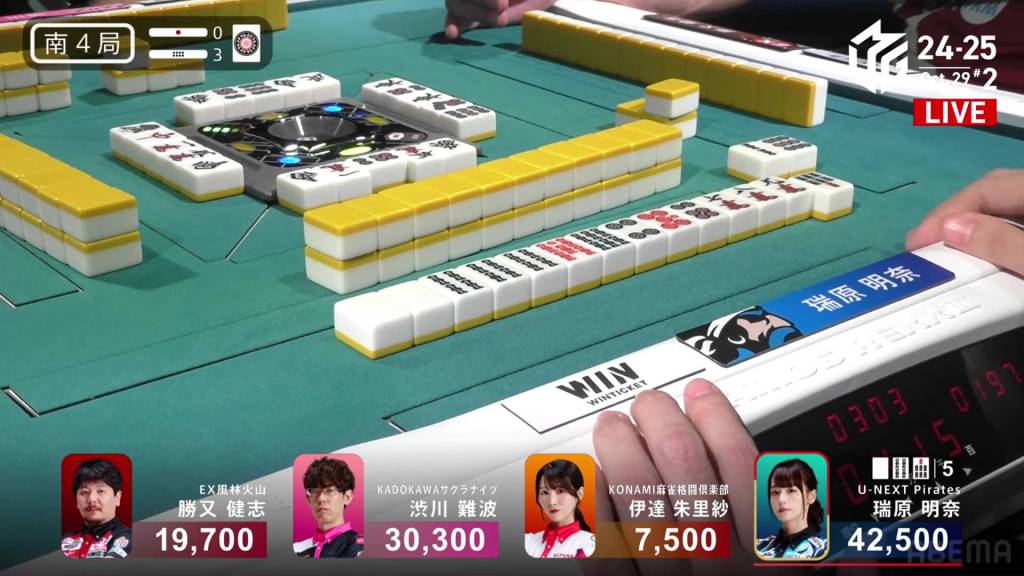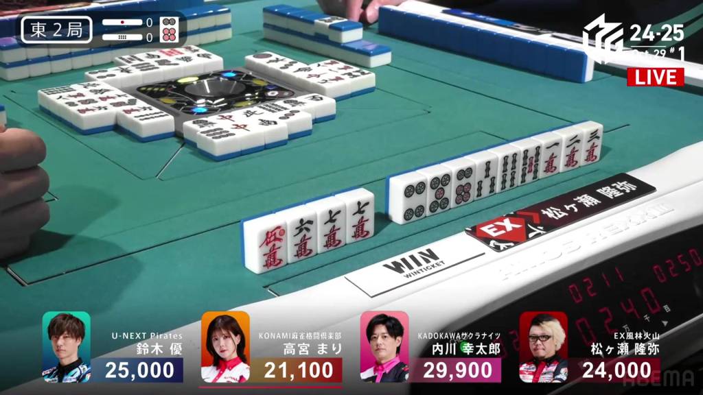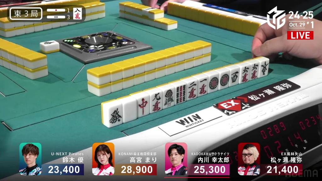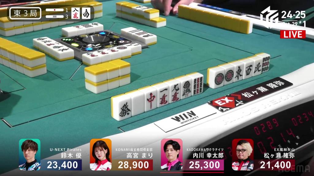 Dealing into Takamiya for Tanyao/Dora 2 for 3,900+900 plus two riichi sticks, Matsugase’s yakuman chance is now a painful deal-in. Yet again, yakuman hunters will have to keep waiting.