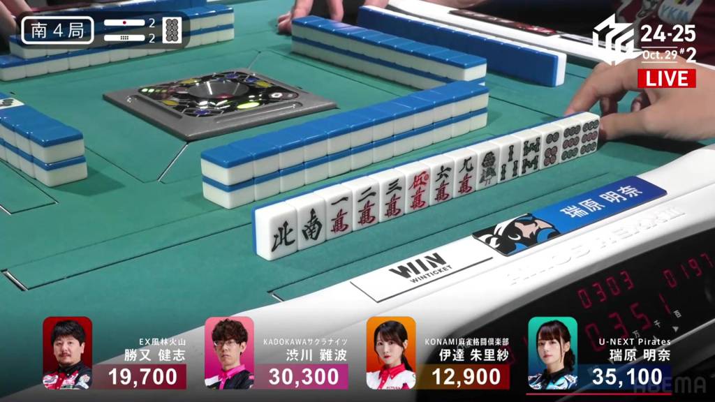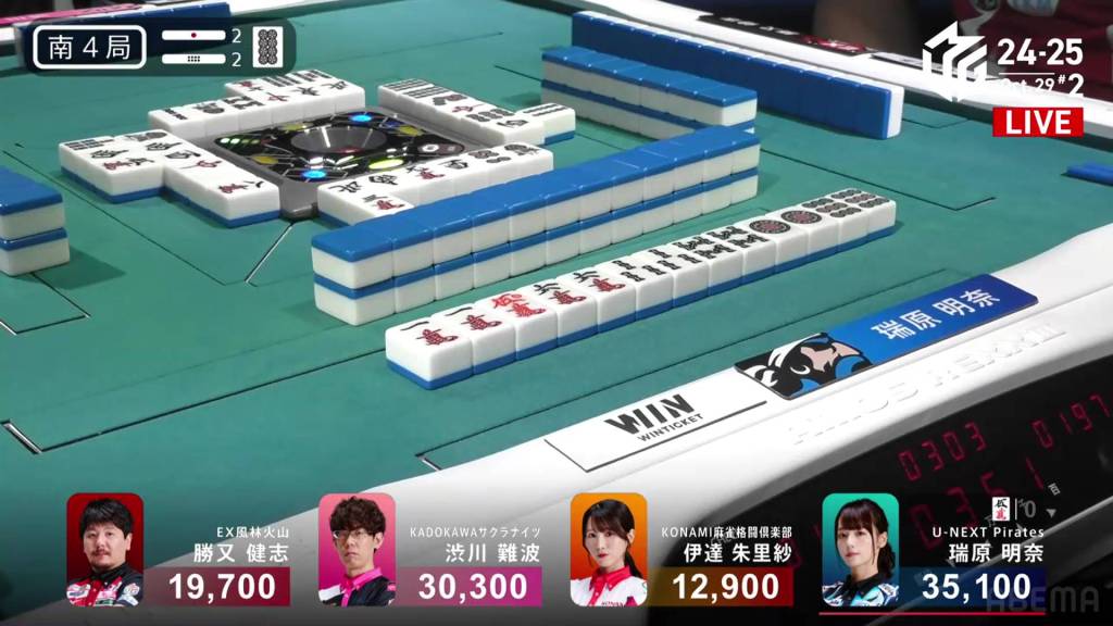 Two turns later, Mizuhara gets the 6m and wins the hand. Mizuhara wins with Riichi/Tsumo/Tanyao/Aka 1 for 2,000+200/4,000+200 plus a riichi stick, brining Mizuhara’s score above 40,000.