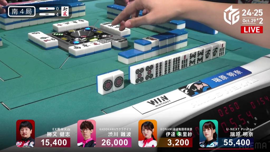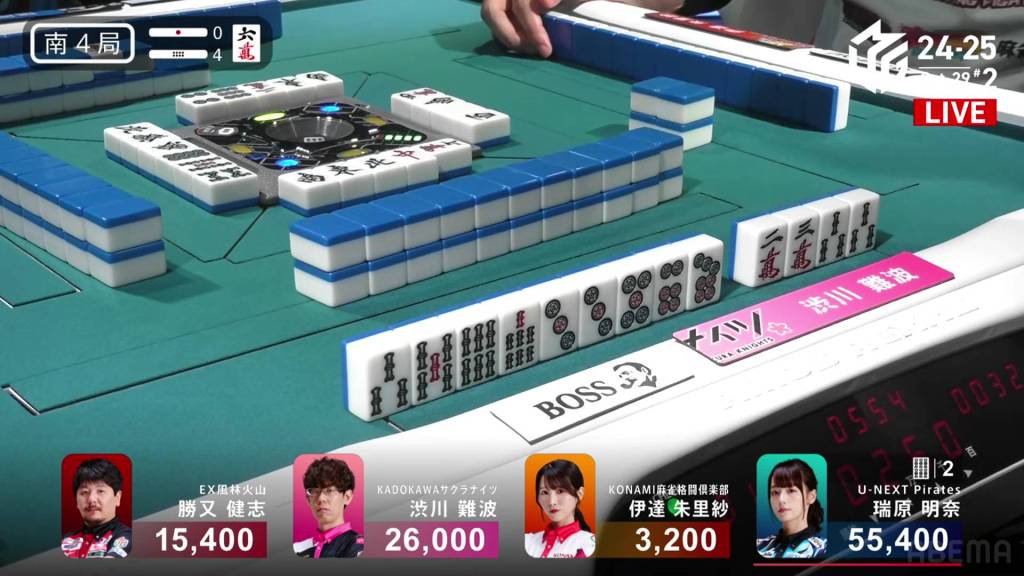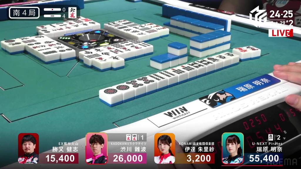 Just three turns later, Mizuhara draws the 7s and wins the hand. Mizuhara wins with Riichi/Tsumo/Aka 2 for 4,000+300 all, pushing Mizuhara above 55,000.