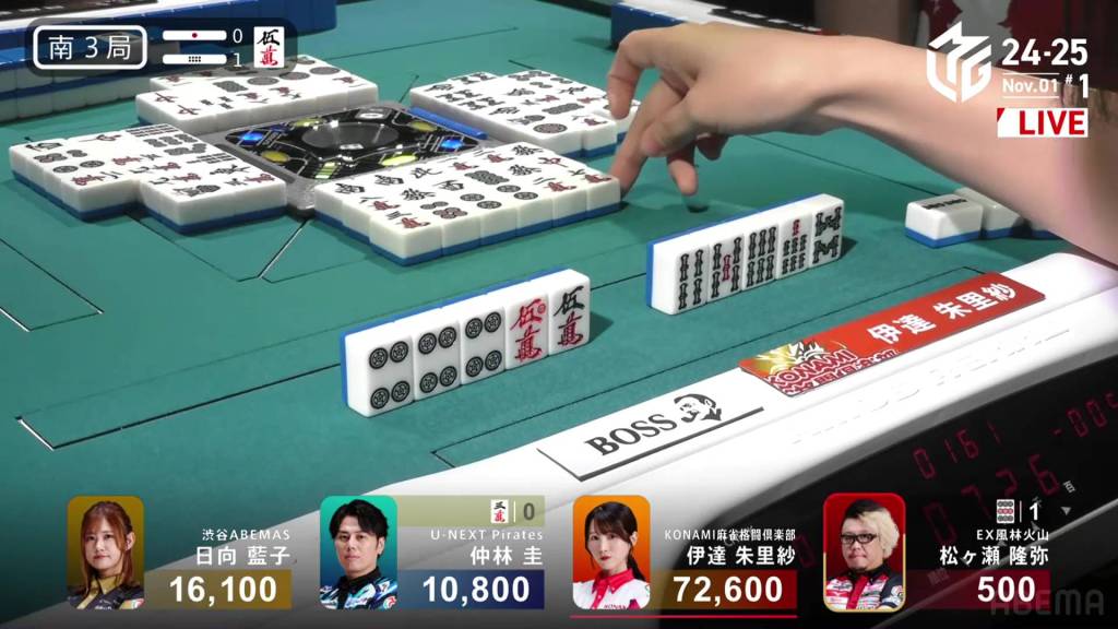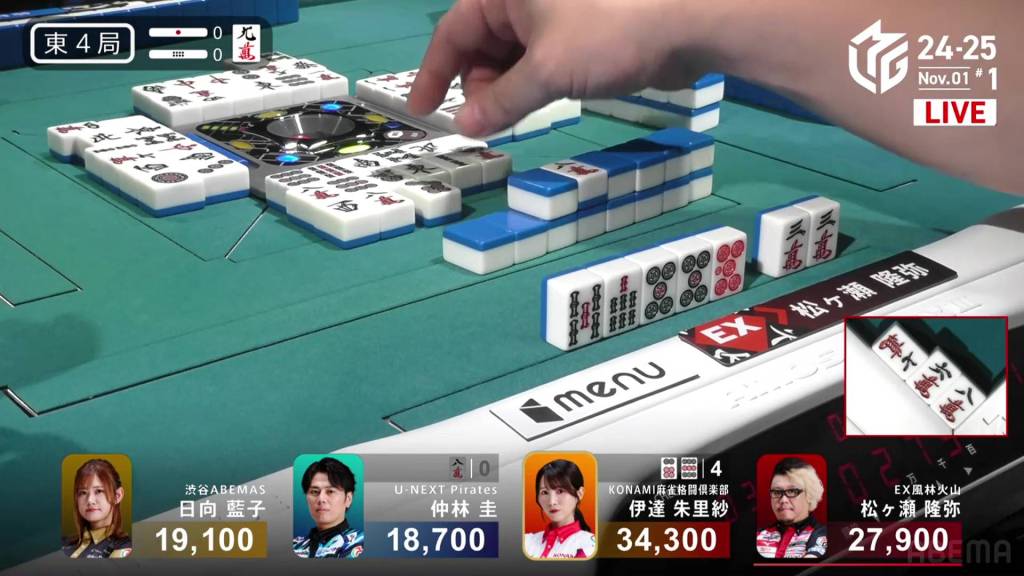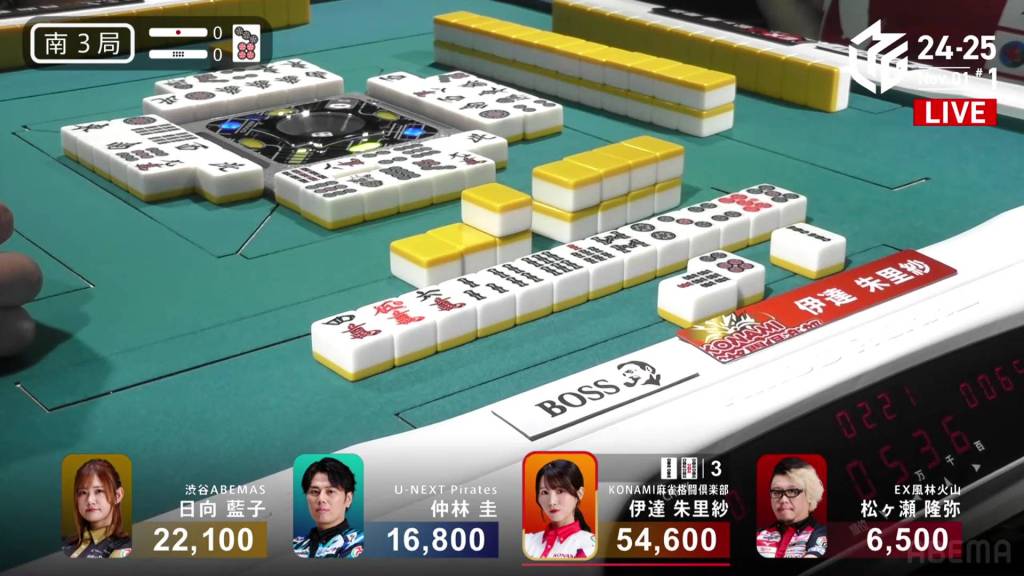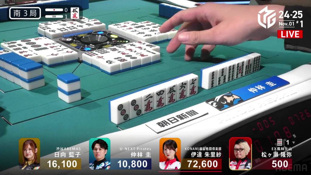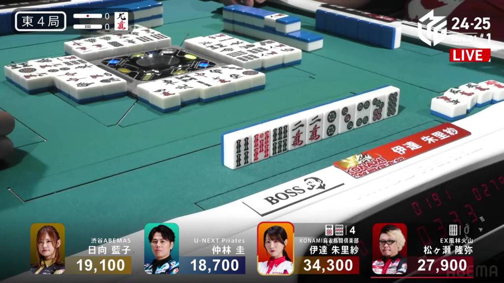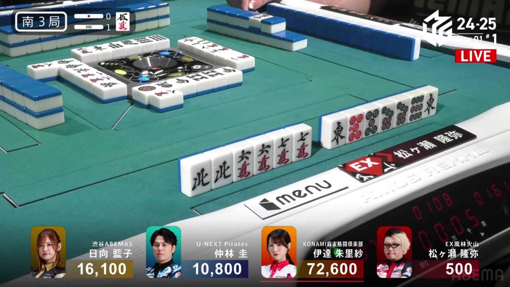 In S3-1, Matsugase is in 4th place with just 500. With one honba and a 10,300 gap between him and 3rd place Nakabayashi, a mangan tsumo would be enough to move him into 3rd place by 100.