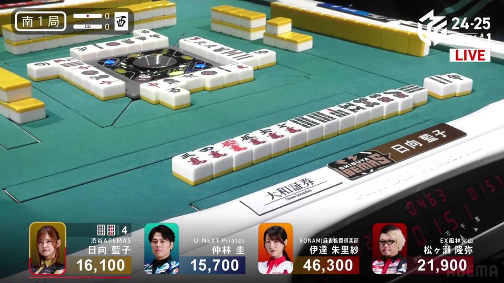 In S1-0, Hinata is the dealer in 3rd plae, 5,800 behind 2nd place Matsugase.
