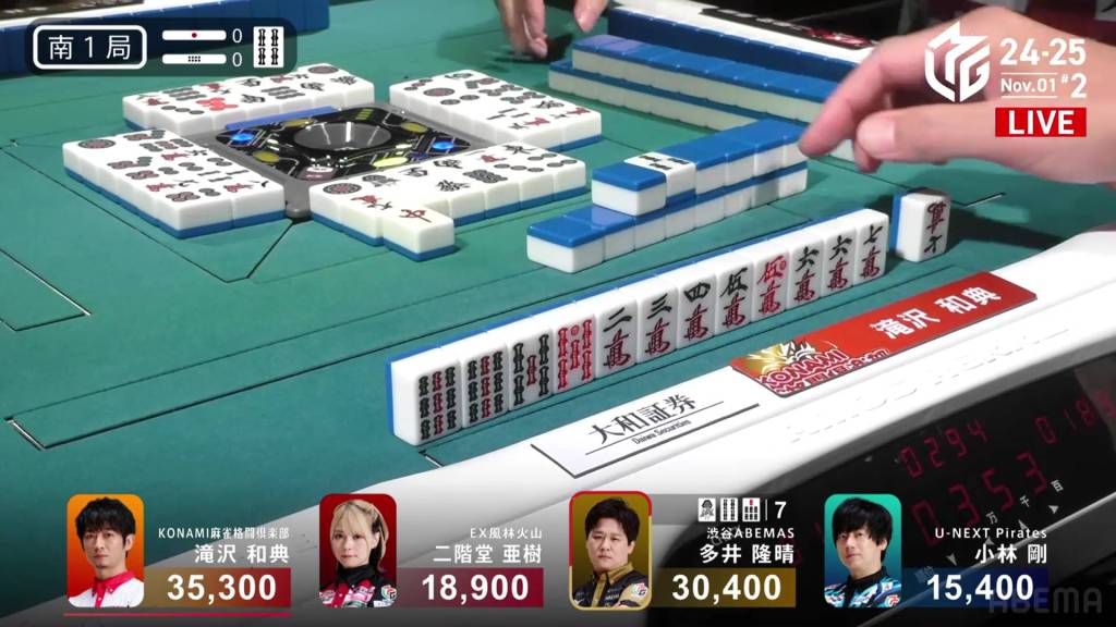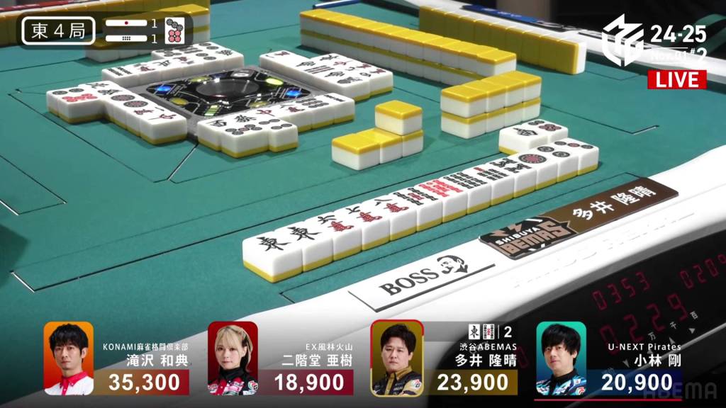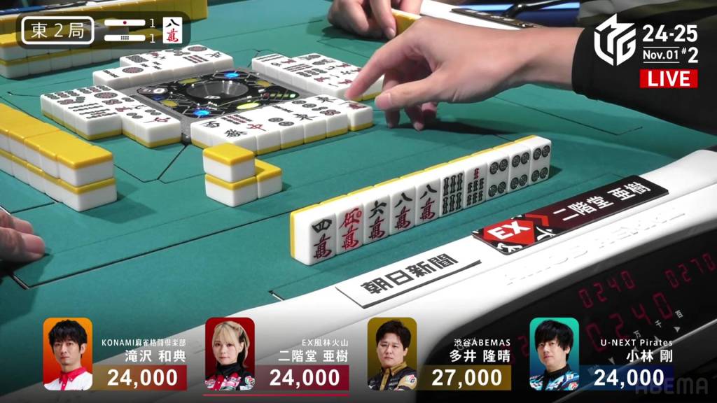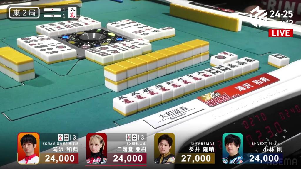 In E2-1, Takizawa is in a three-way tie for 2nd place after Ooi called riichi and took the hand to a draw.
