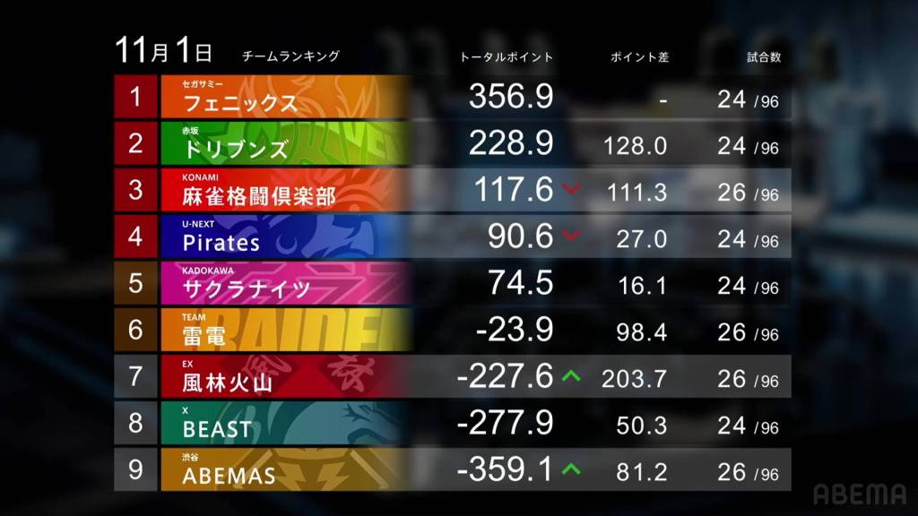 FInally, we have the EX Furinkazan. Matsugase had a rough week this week, playing two games and losing both of them. In one of them, he was tenpai for yakuman quite early and ended up dealing in. With neither Katasumata nor Aki able to get a 1st to counteract it, the team drops to below -200.0pts going into November.