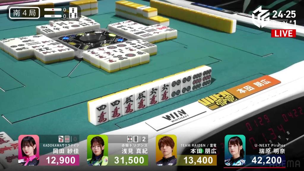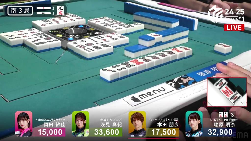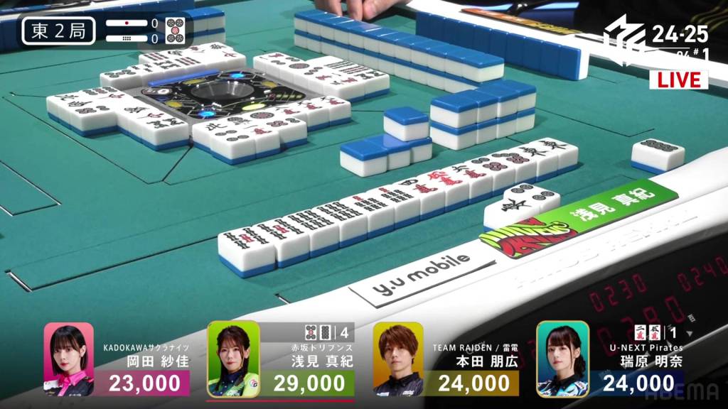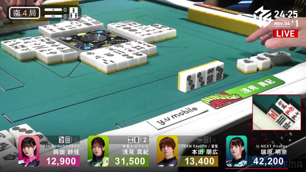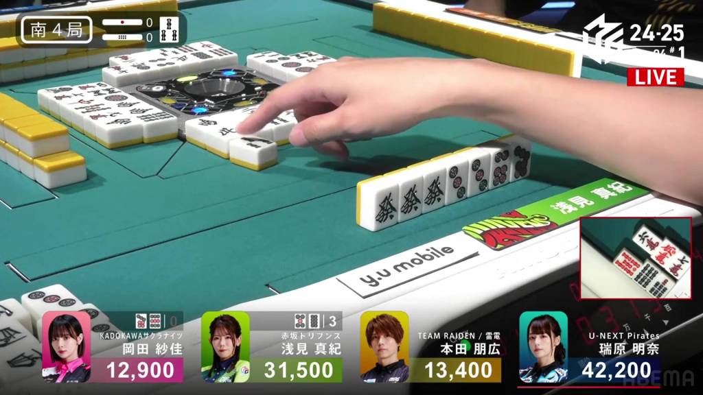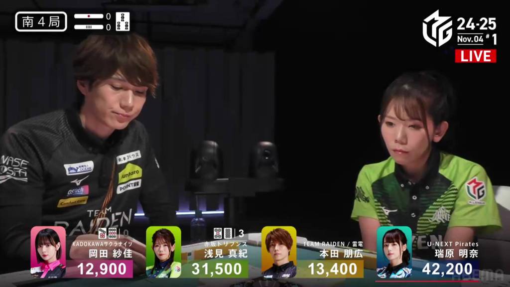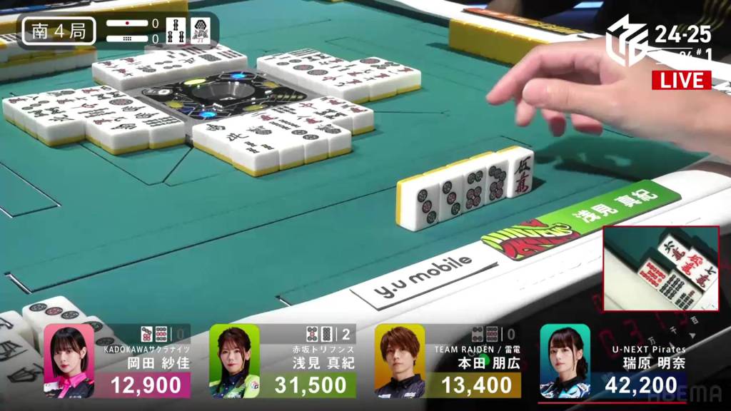 In S3-1, Mizuhara is in 2nd place and has cut down 1st place Asami’s lead to just 700. Any win will be enough to move into 1st, with the riichi stick and a honba on the table giving a little extra.