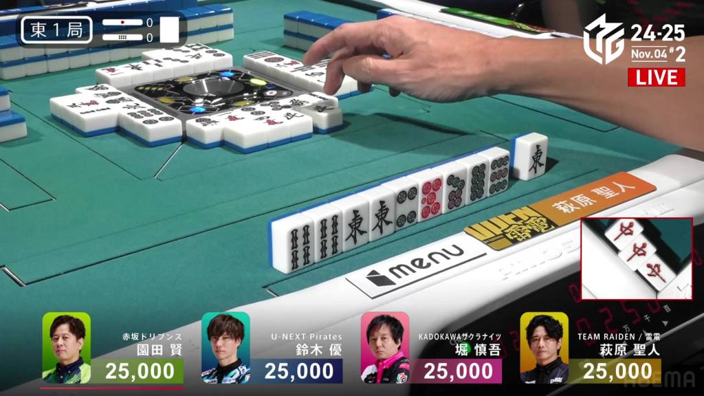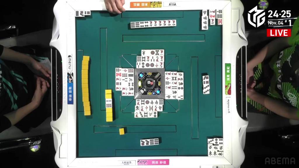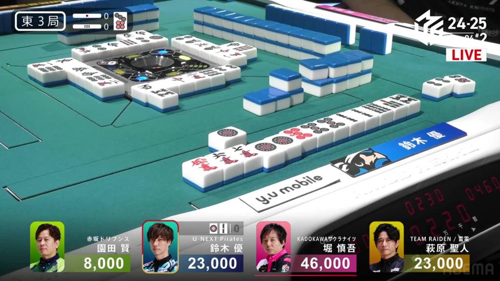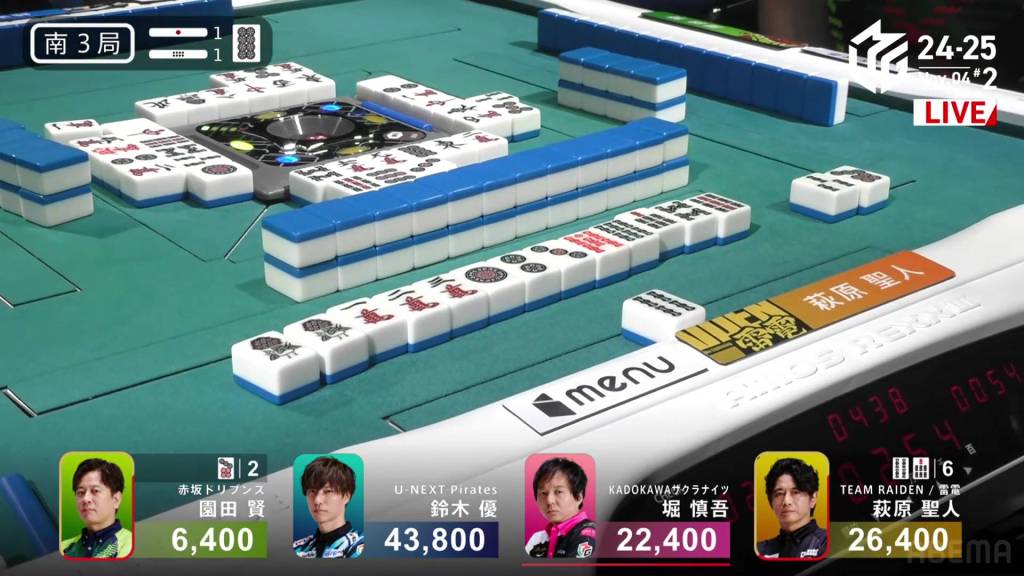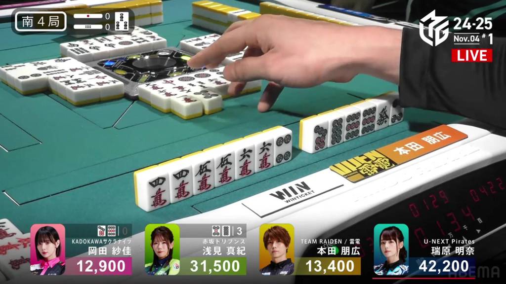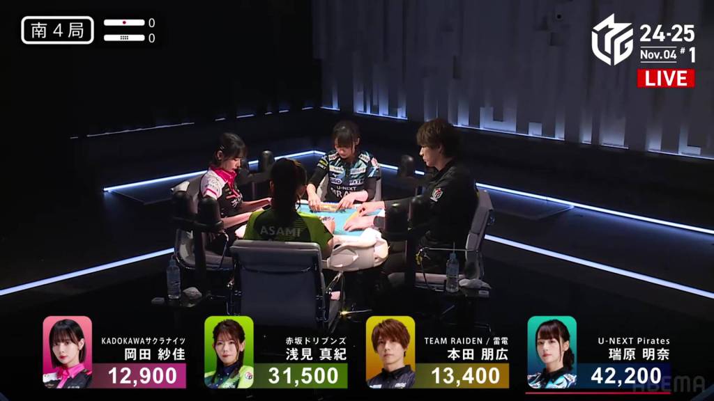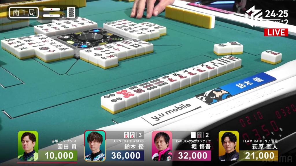 In S3-1, Mizuhara is in 2nd place and has cut down 1st place Asami’s lead to just 700. Any win will be enough to move into 1st, with the riichi stick and a honba on the table giving a little extra.